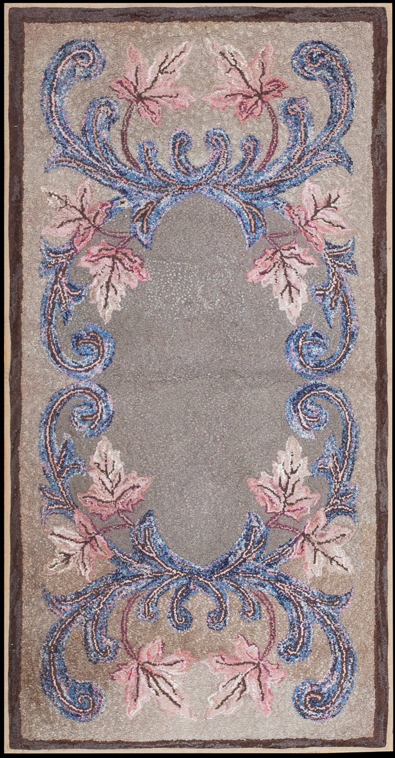 The palette is restrained yet vibrant, centered around a subtly mottled field of taupe and gray color rugs. This neutral ground allows the highly detailed scrolling foliage to stand out in striking contrast. The use of variegated wools creates a depth of color, blending soft rose pinks with rich indigo and slate blues in the elaborate framework surrounding the central void.