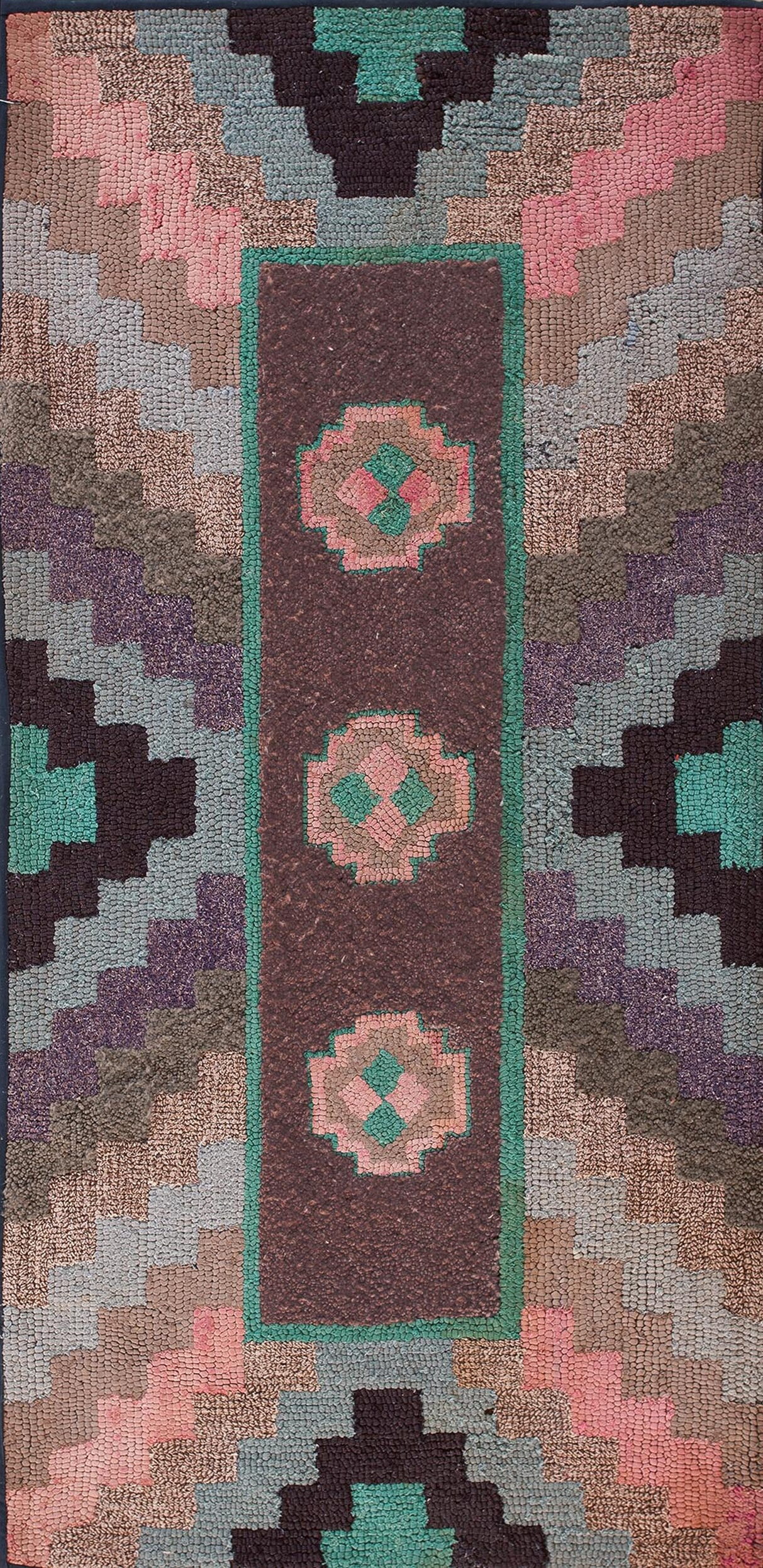 Antique American Hooked Rug American Brown 1920s Brown, Circa Date: 1920s. This exceptional piece exemplifies the craft of the American Hooked Rug tradition, showcasing the resourceful artistry typical of early 20th-century textile work. Its structure features a highly textural surface created by the looping technique, giving the design a unique, almost three-dimensional depth.