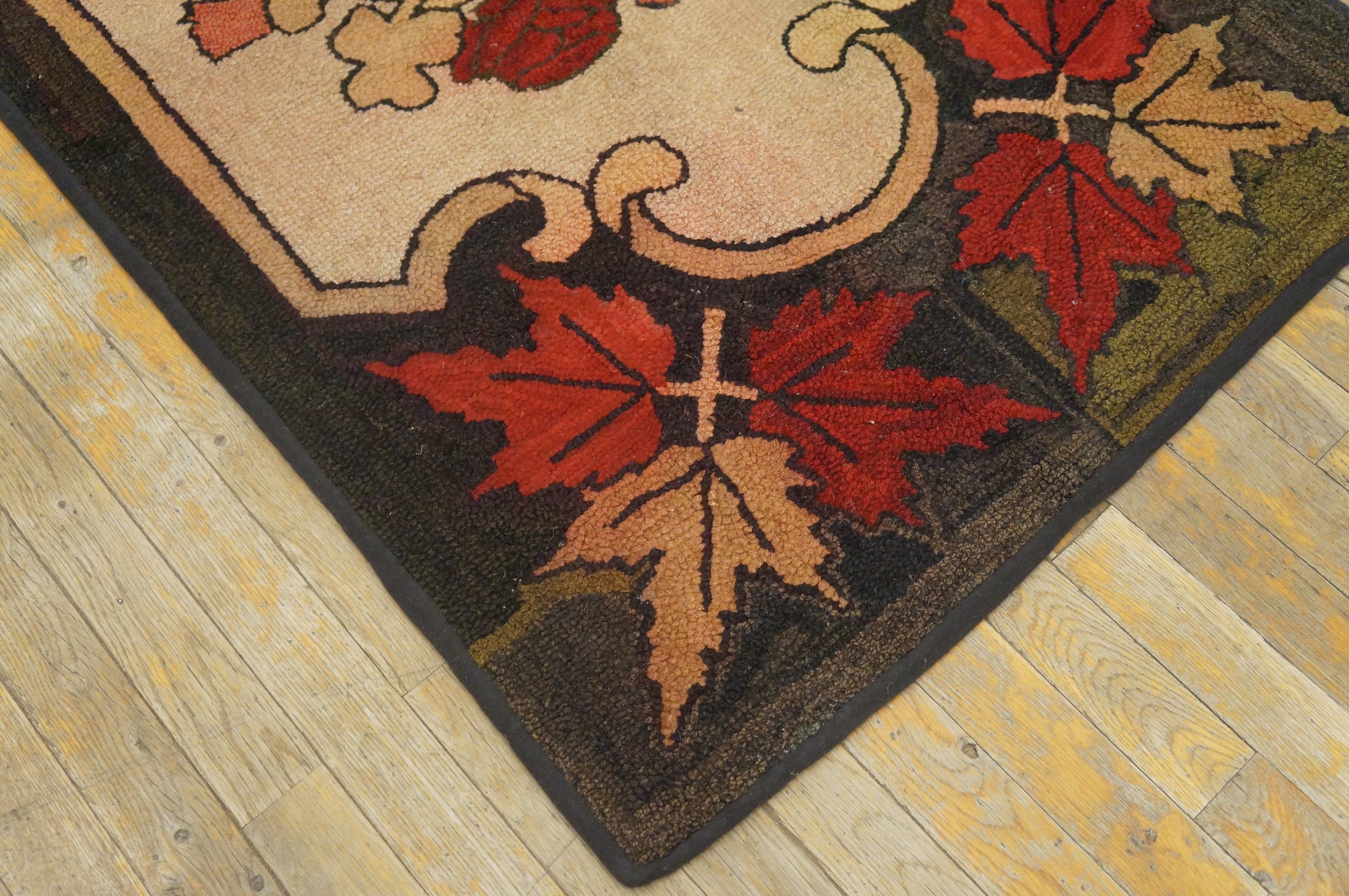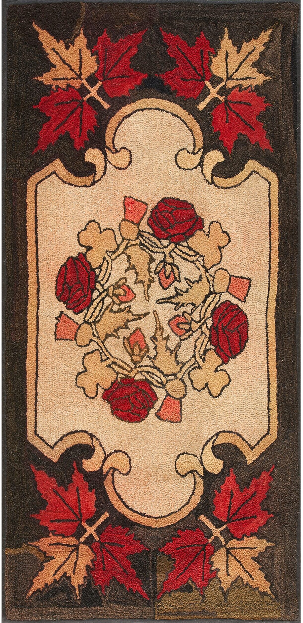 The corners feature pairs of stylized maple leaves—rendered in vibrant red and warm tan—which break the dark ground, adding an autumnal richness to the composition. The inherent texture of the hooked construction provides a unique, resilient surface, distinguishing it sharply from more formal woven pile carpets.