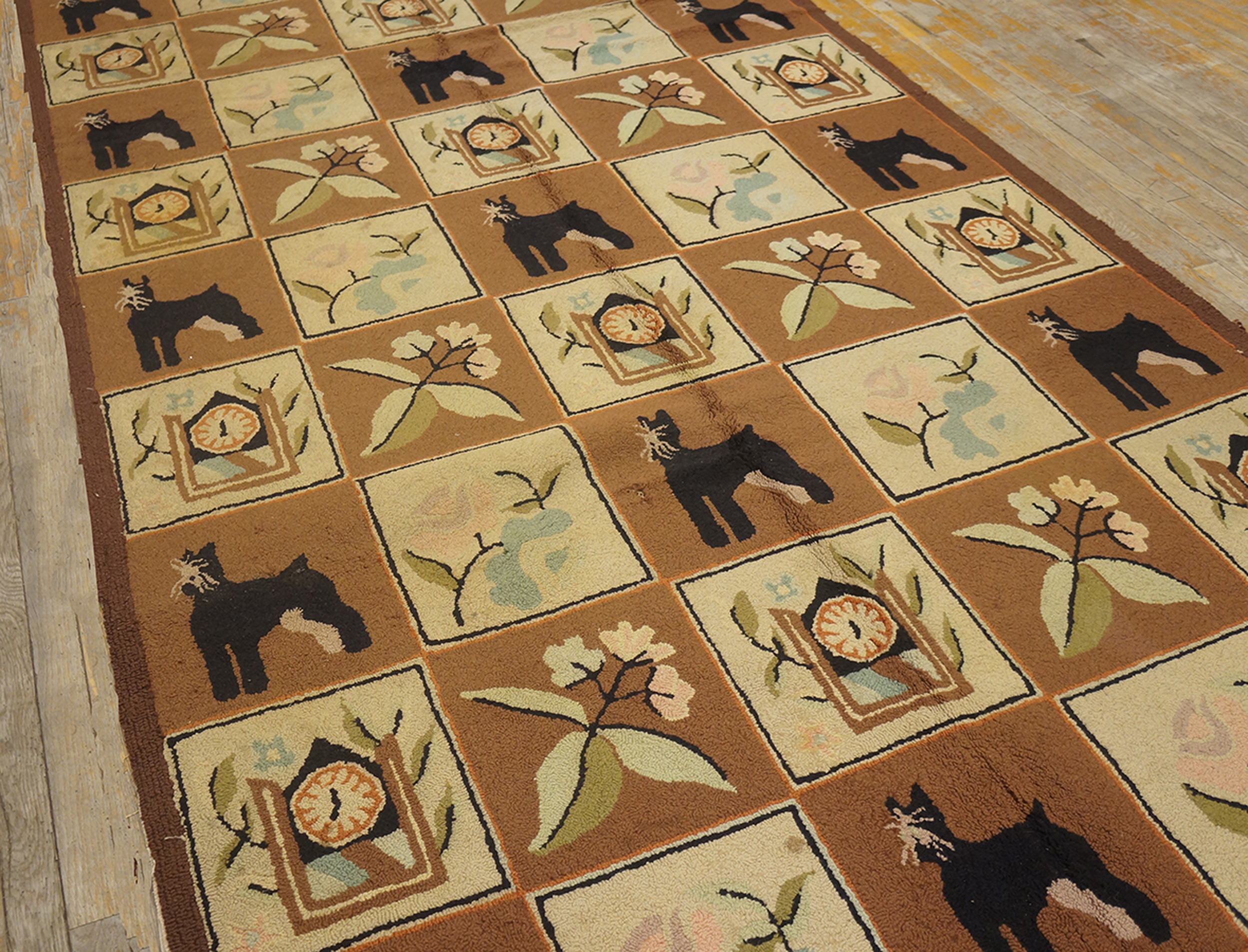 Reflecting the domestic craft revival of the 1970s, this rug offers a unique blend of traditional technique and mid-century sensibility. It is a highly collectible piece among vintage area rugs, perfect for those seeking a statement floor covering with narrative charm and historical context.