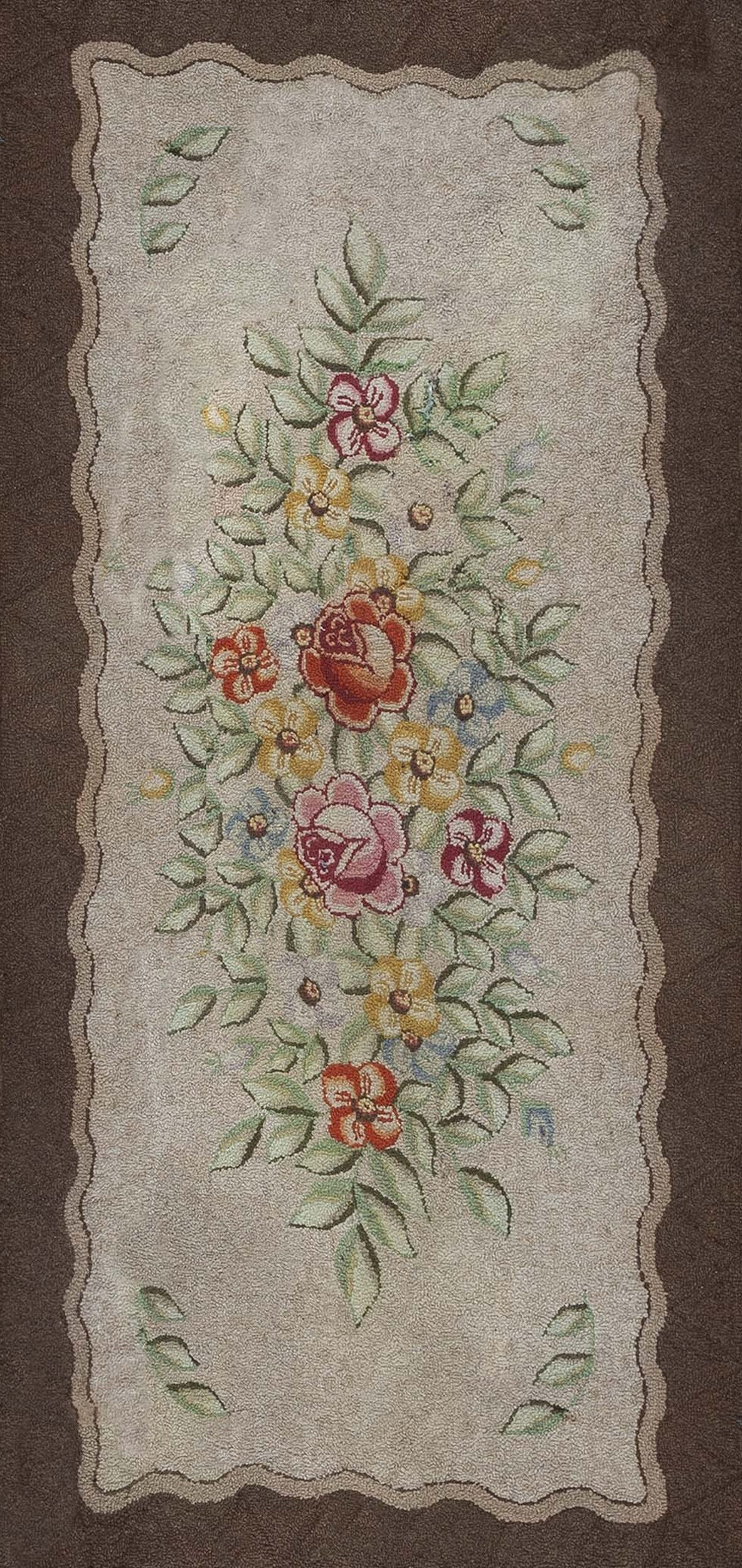 The central design features a lush, cascading bouquet of flowers, typical of floral rugs that gained popularity in domestic American settings during the mid-20th century. Roses, daisies, and small filler blossoms are rendered in vibrant yet muted tones of salmon, pale yellow, and sage green, creating an appealing contrast against the field.
