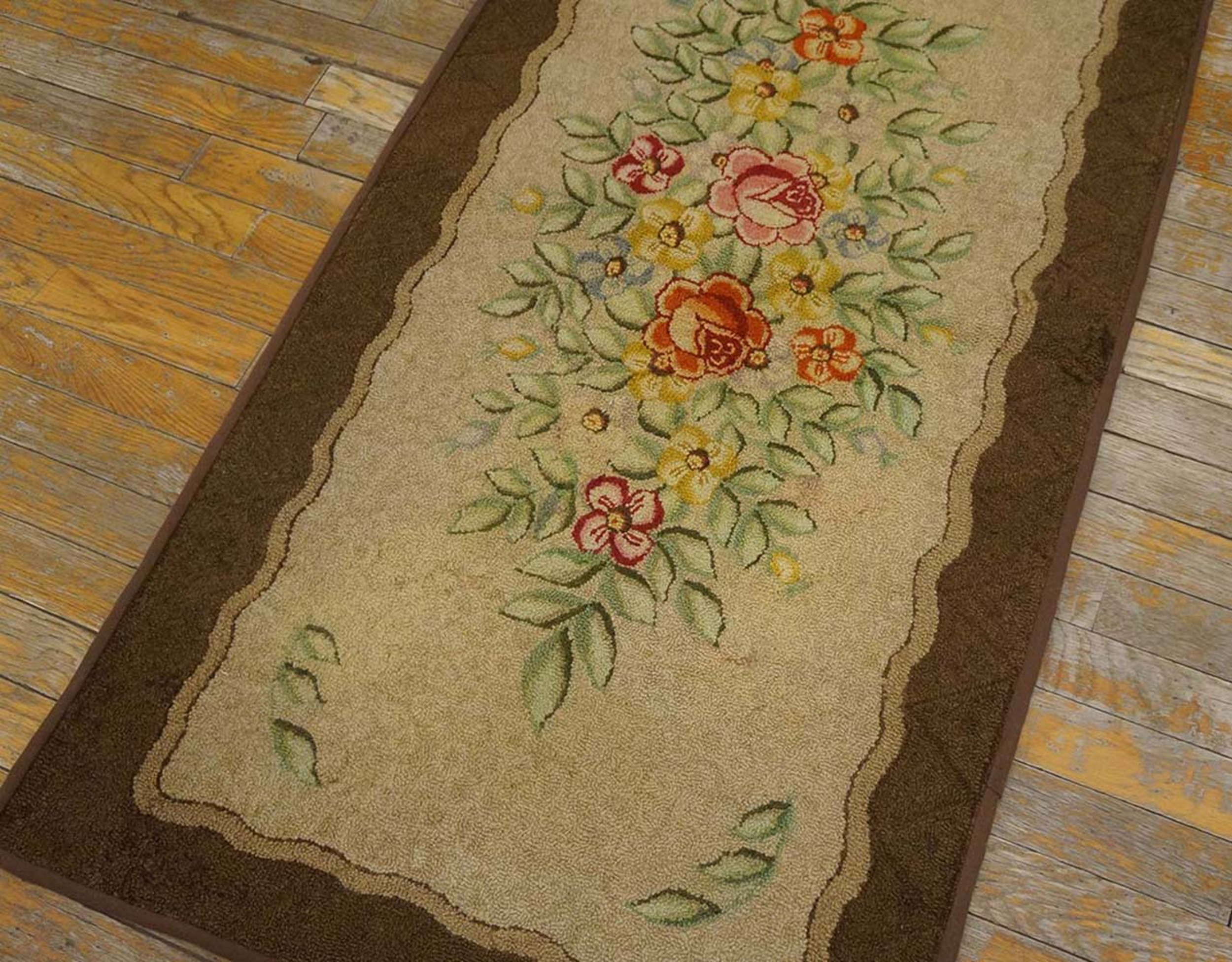 Vintage American Hooked Rug American Ivory 1980s, Circa Date: 1980s. This delightful textile exemplifies the enduring charm of the American Hooked Rug tradition, showcasing a folk art sensibility combined with refined color work. The technique, characterized by loops pulled through a backing material, provides a textural depth that is both robust and visually soft, perfectly suited for high-traffic areas.