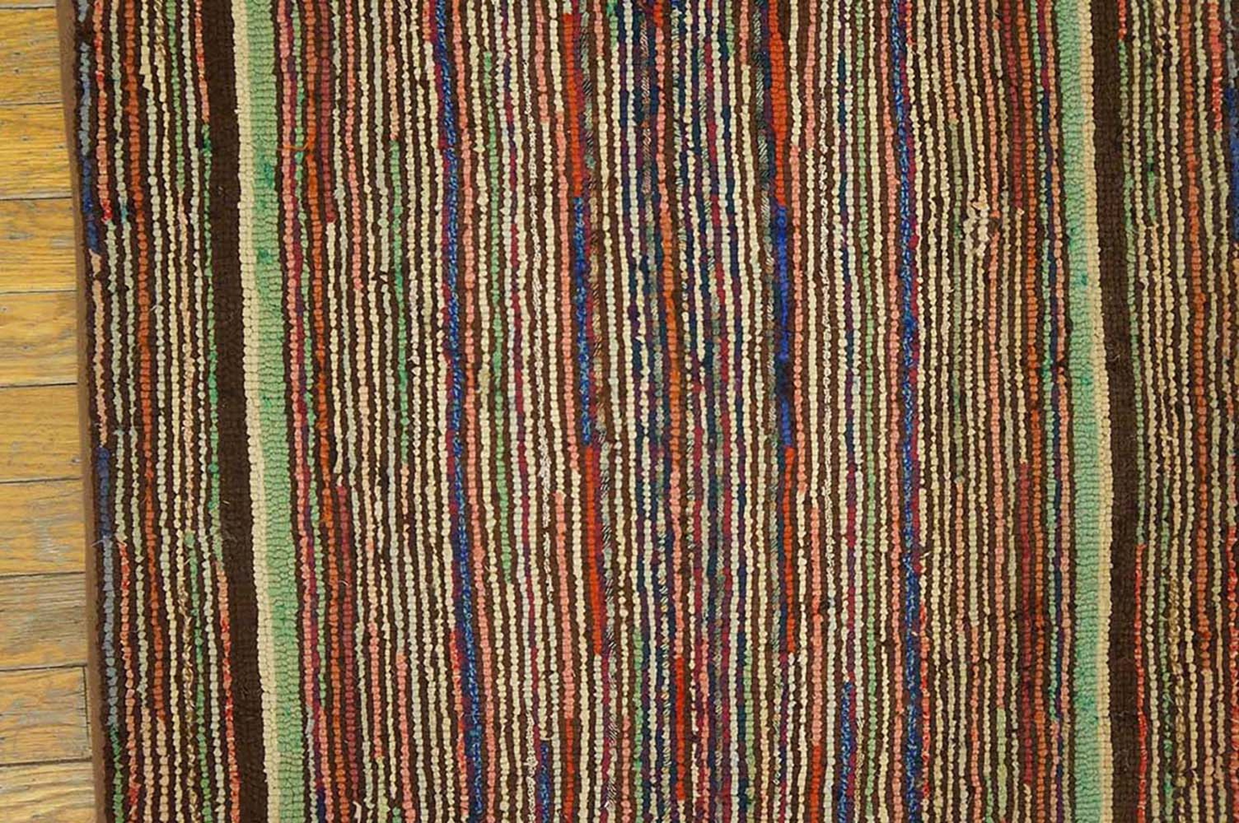 Executed in the traditional hooked technique, the texture of the surface is tactile and robust, emphasizing the handmade nature of the piece. The stripe motif covers the entire field, functioning as an effective allover pattern that eliminates the need for borders or centralized medallions. Given its dimensions, this piece is ideally suited for use as a decorative accent or small scatter size rug in a refined interior setting.