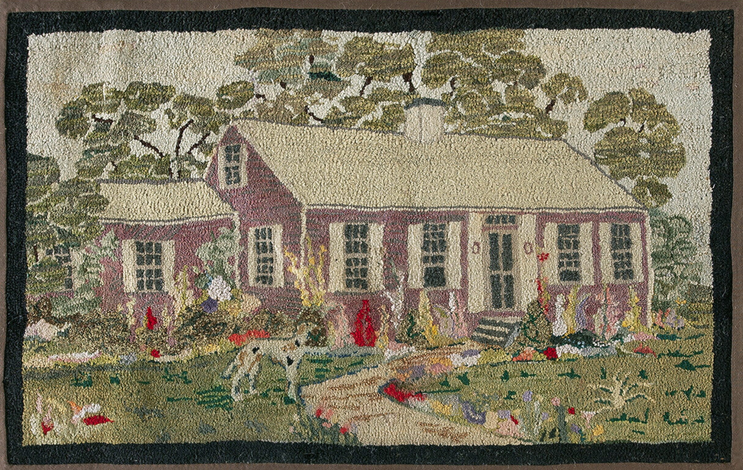 The detailed scene depicts a quintessential American farmhouse, rendered in a charmingly naive style typical of folk art. The composition is balanced by mature trees framing the structure and a detailed foreground featuring a garden path and a spotted companion dog. This blend of architecture and nature places it firmly within the tradition of floral rugs and pictorial tapestries.