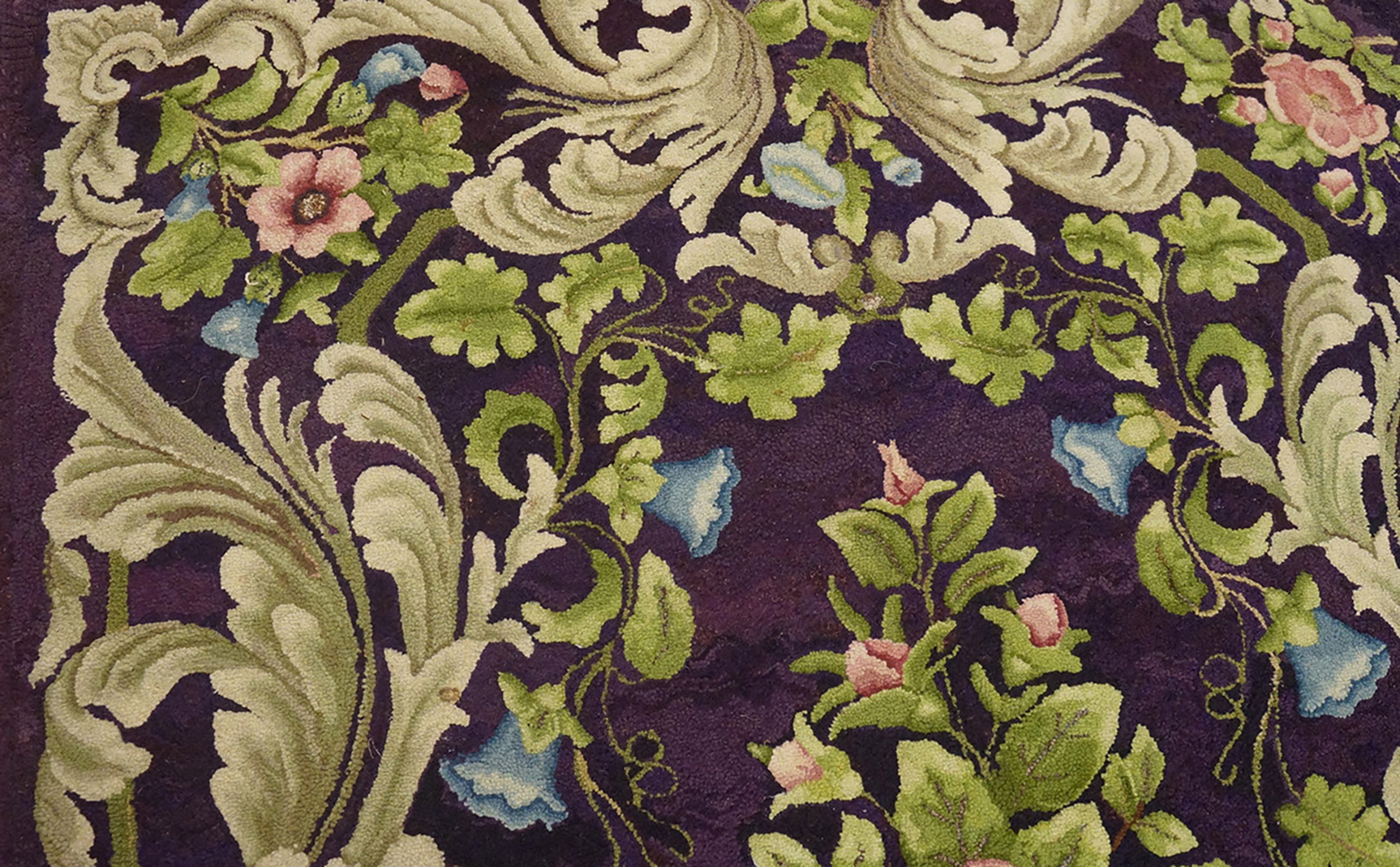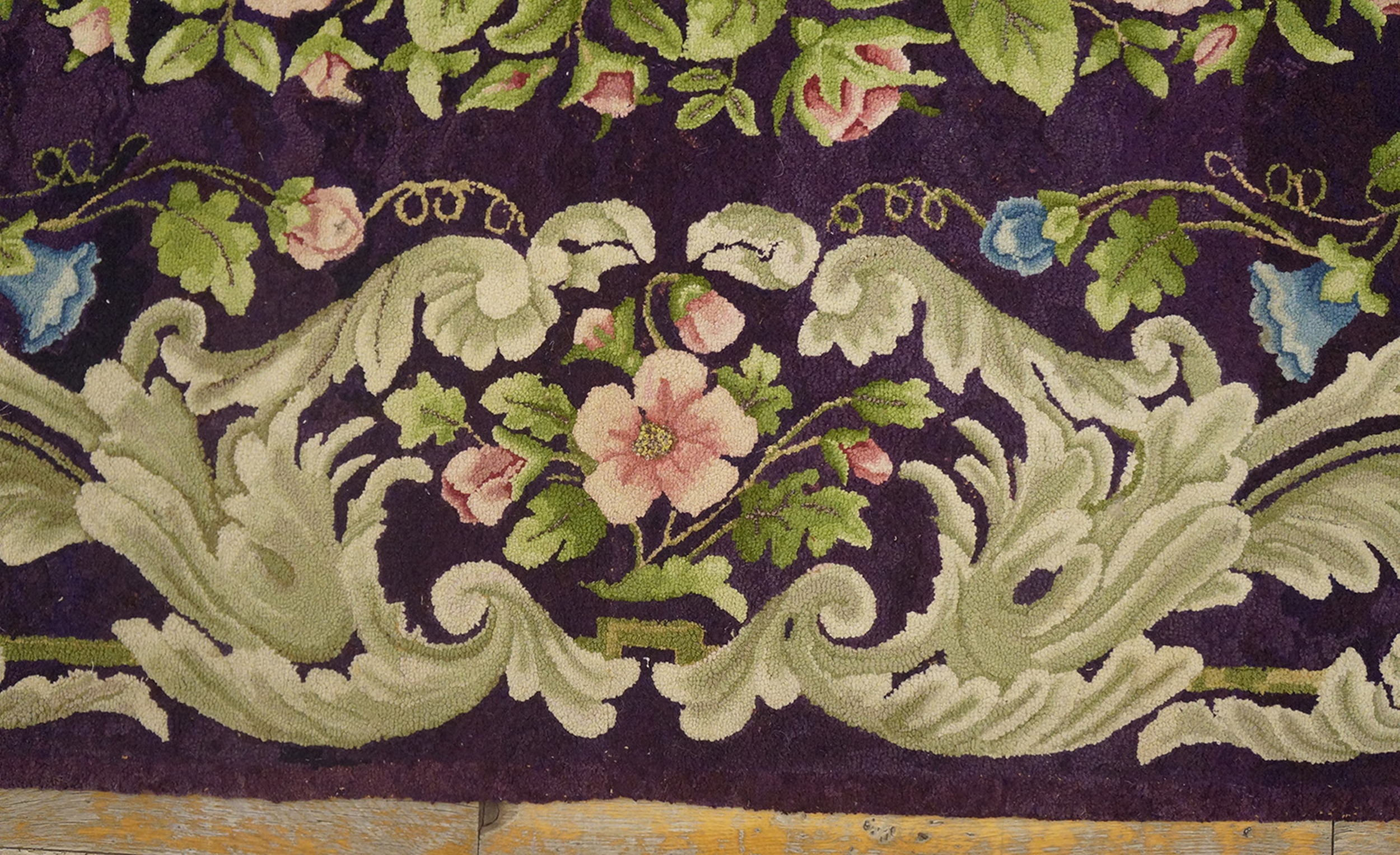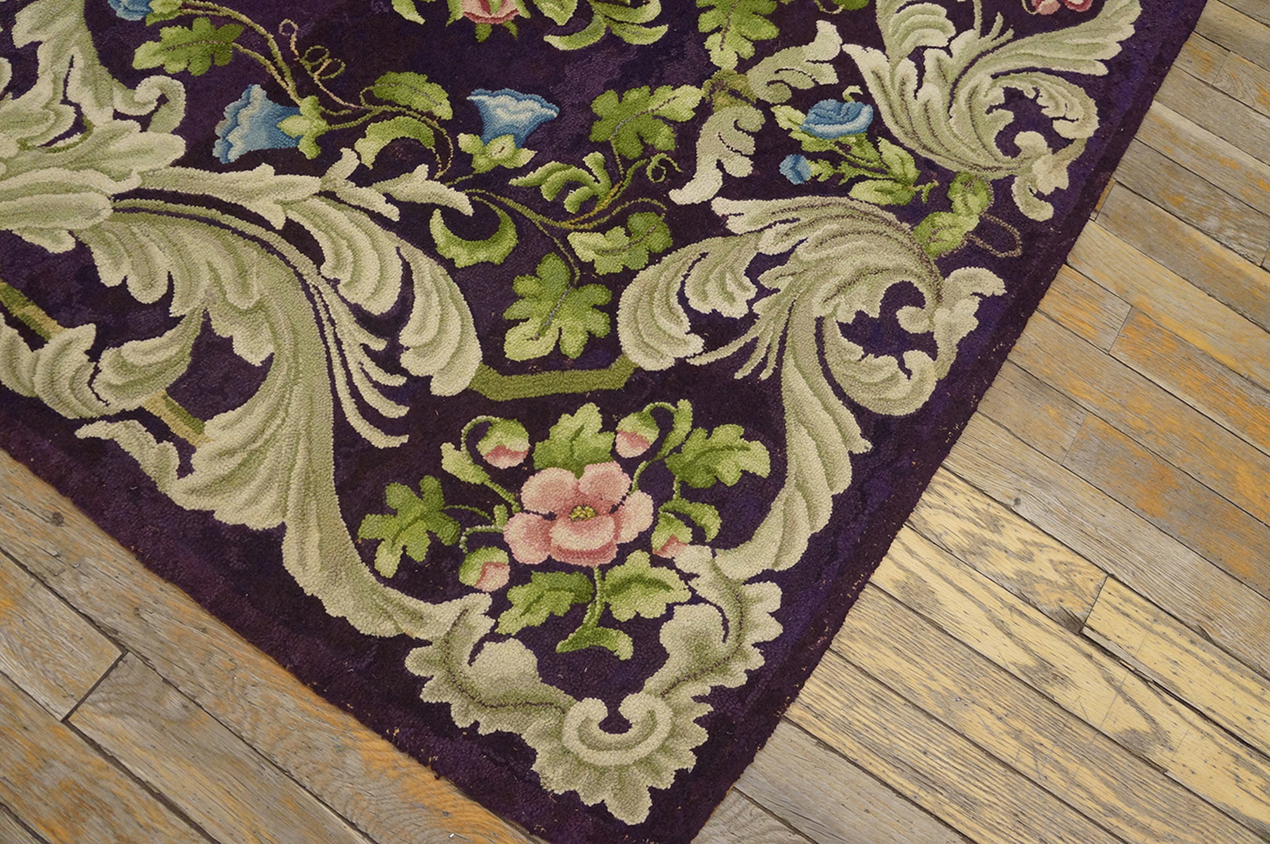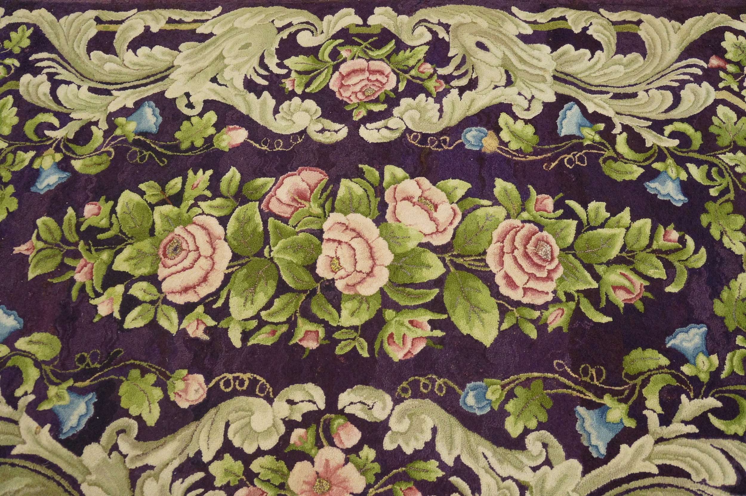 Antique American Hooked Rug American Purple 1920s, Circa Date: 1920s. This exceptional example of an American Hooked Rug captures the decorative exuberance of the early 20th century, elevating a traditional craft technique into a sophisticated textile art piece. The density of the hooking technique provides a rich, tactile surface that beautifully interprets the elaborate botanical motif.