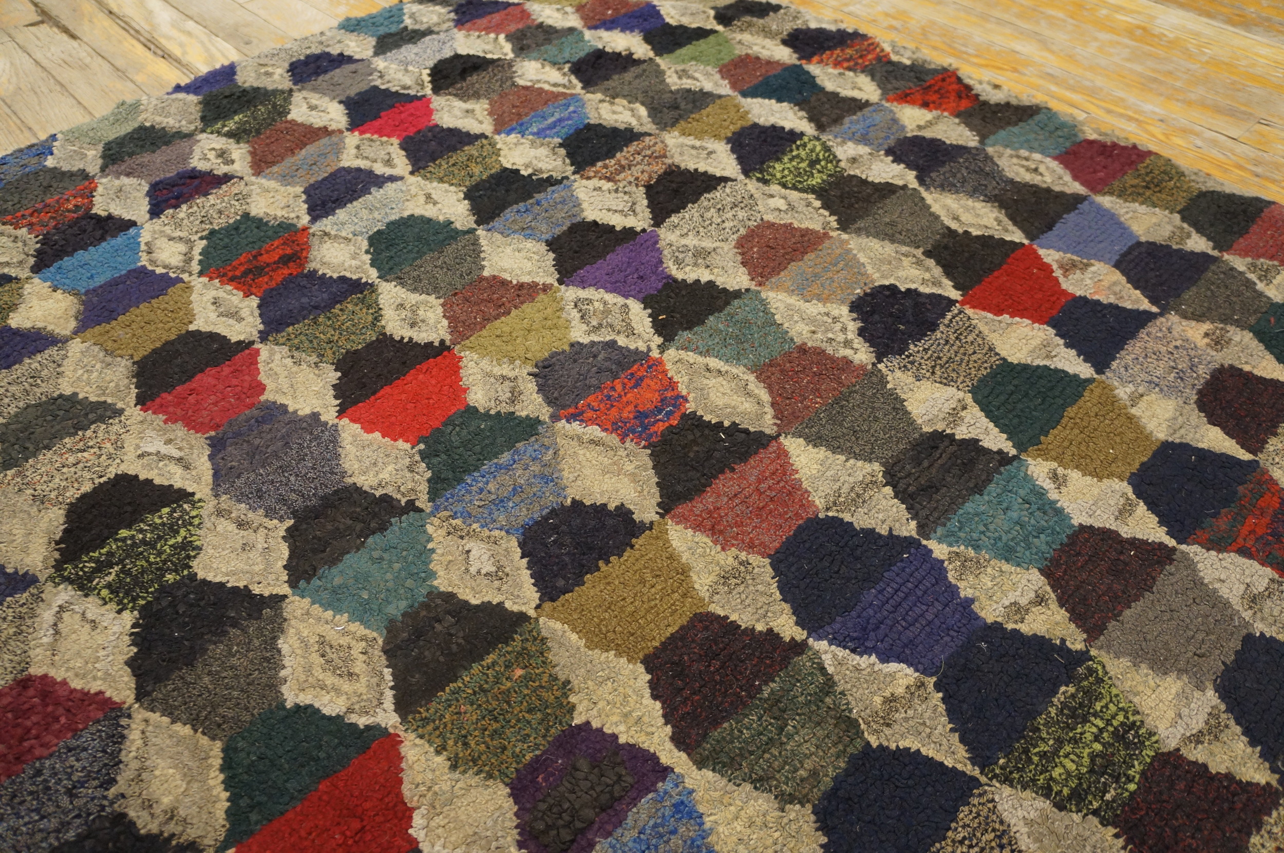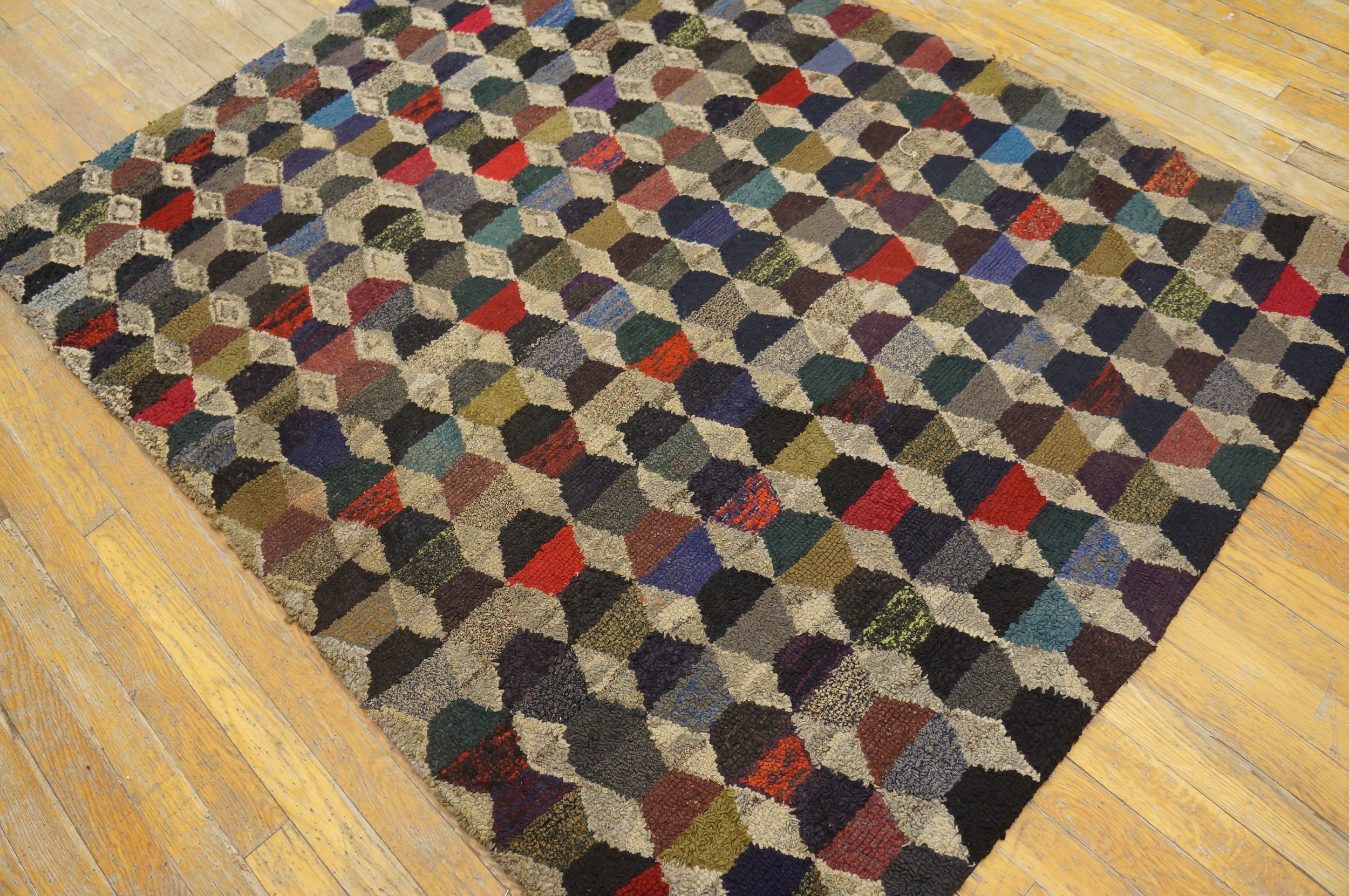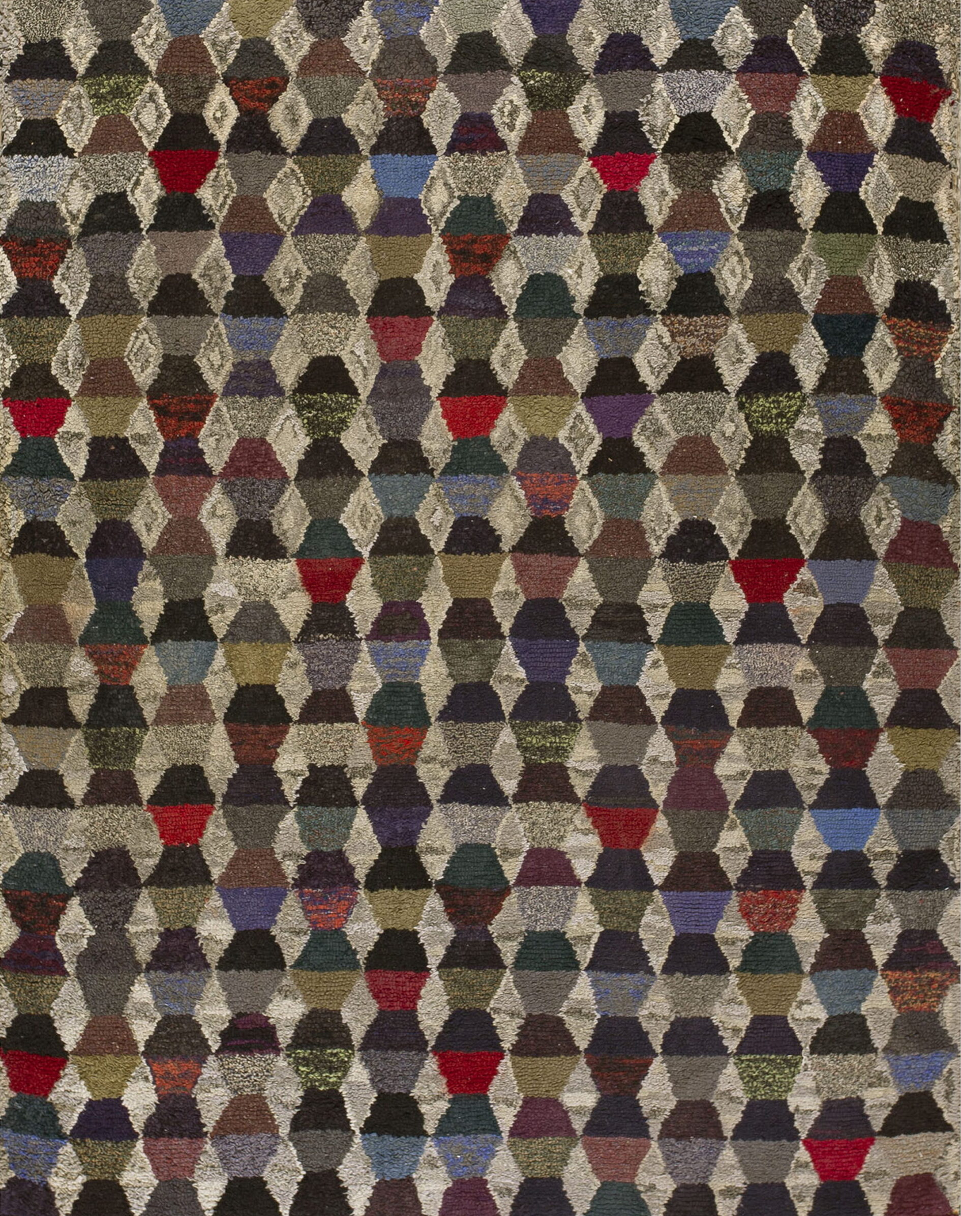The field is dominated by a complex, repeating tessellation of diamond and hexagonal shapes, creating a dynamic visual rhythm across the surface. This sophisticated geometric structure moves beyond simple striping, demonstrating a highly developed sense of pattern composition rarely seen in American USA Rugs of this period.