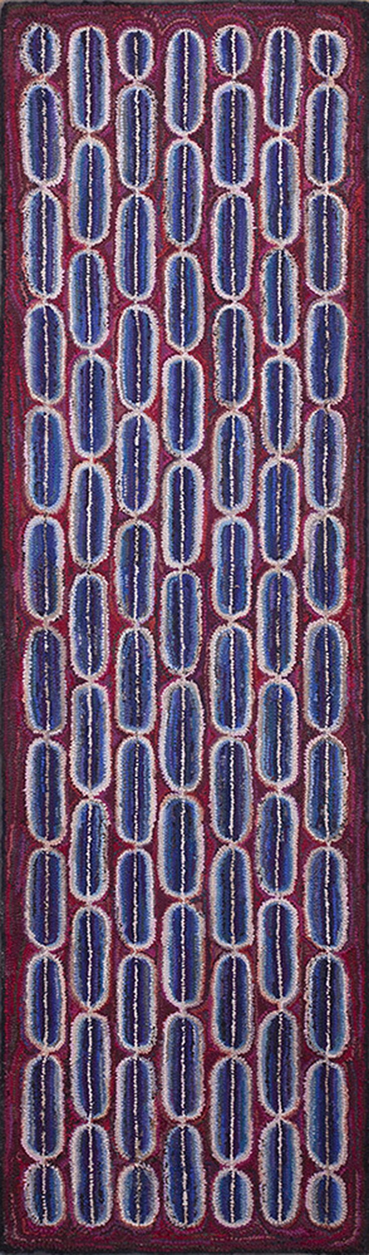 The composition is defined by a highly abstracted, repeating geometric motif. Elongated, capsule-like forms, rendered in varying shades of indigo and pale blue, are arranged in offset columns, creating a dynamic visual rhythm. This dense repetition establishes an allover design characteristic of modernist folk interpretations.