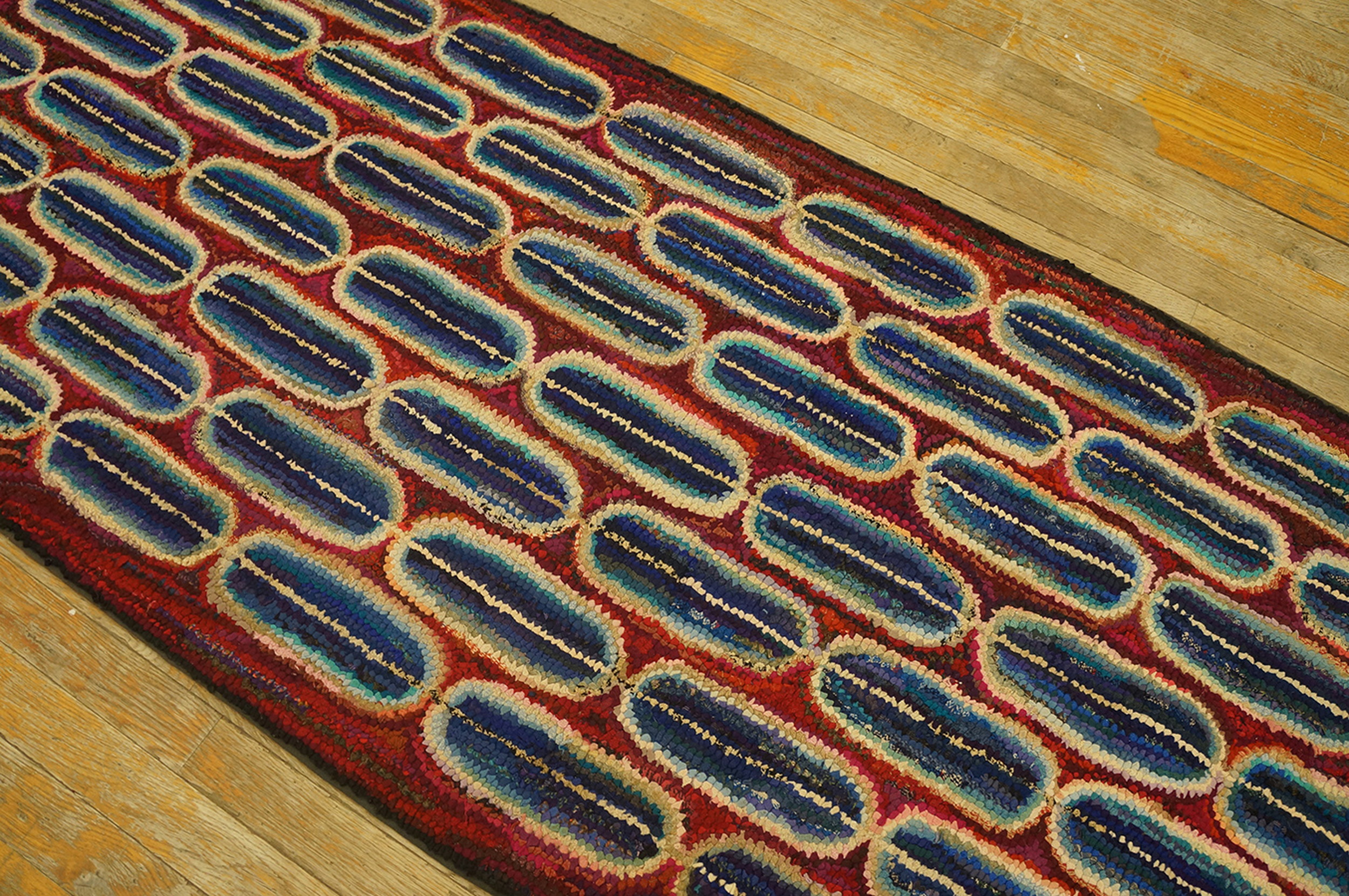 Antique American Hooked Rug Hallway Runner Wool & Cotton Coral, Circa Date: 1930s. This striking American textile is a testament to early 20th-century craft traditions. The robust hooked technique, utilizing wool and cotton, creates a dense, tactile surface that defines this category of antique rugs.