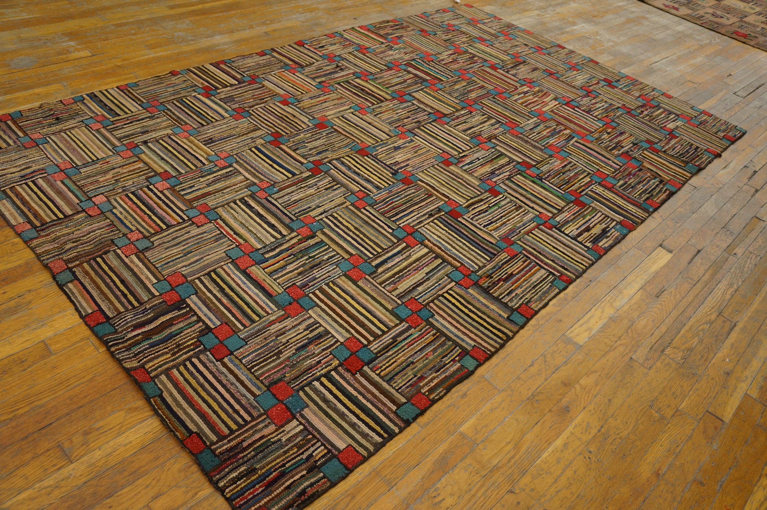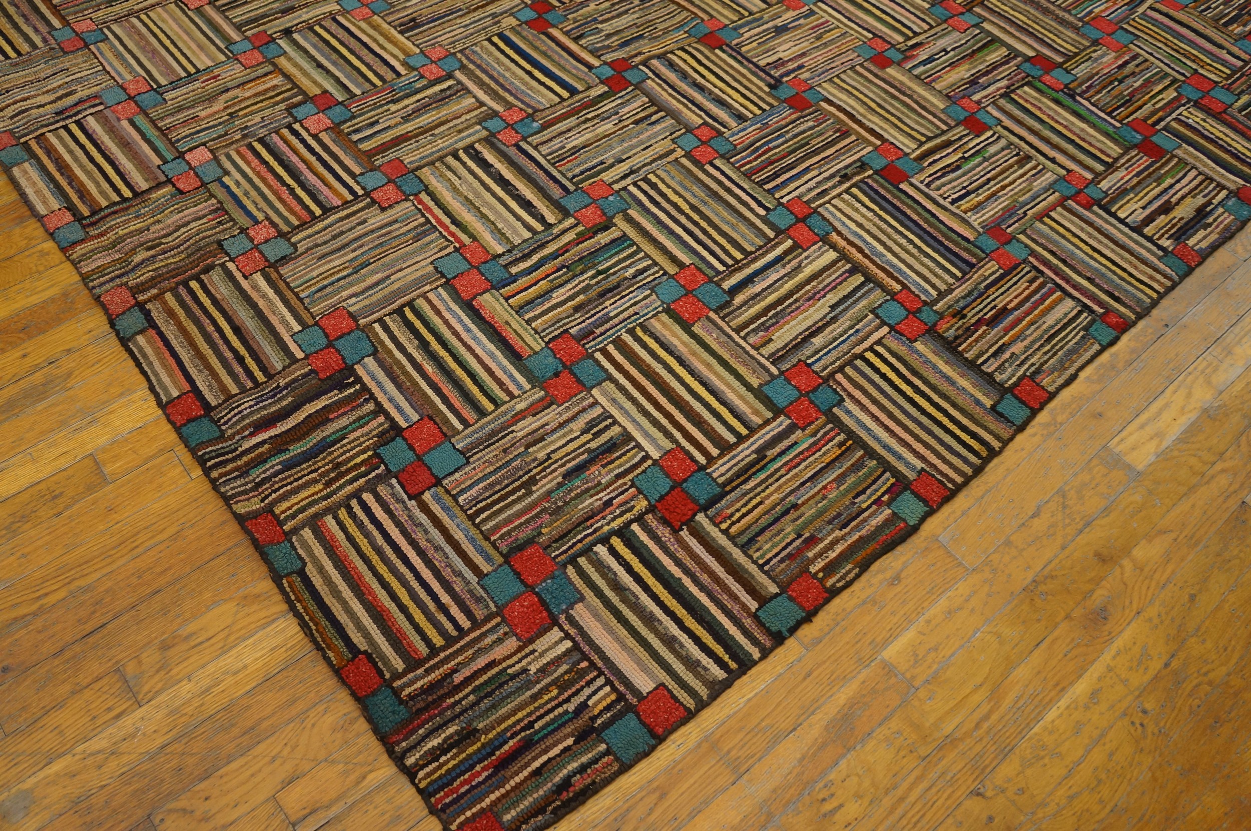 Antique American Hooked Rug Hallway Runner Wool Multi, Circa Date: 1920s. This exceptional American hooked rug presents a vibrant, highly graphic interpretation of early 20th-century textile art, showcasing the domestic craftsmanship typical of the era. It stands as a compelling example among antique rugs that prioritize texture and bold, abstract design over traditional motifs.