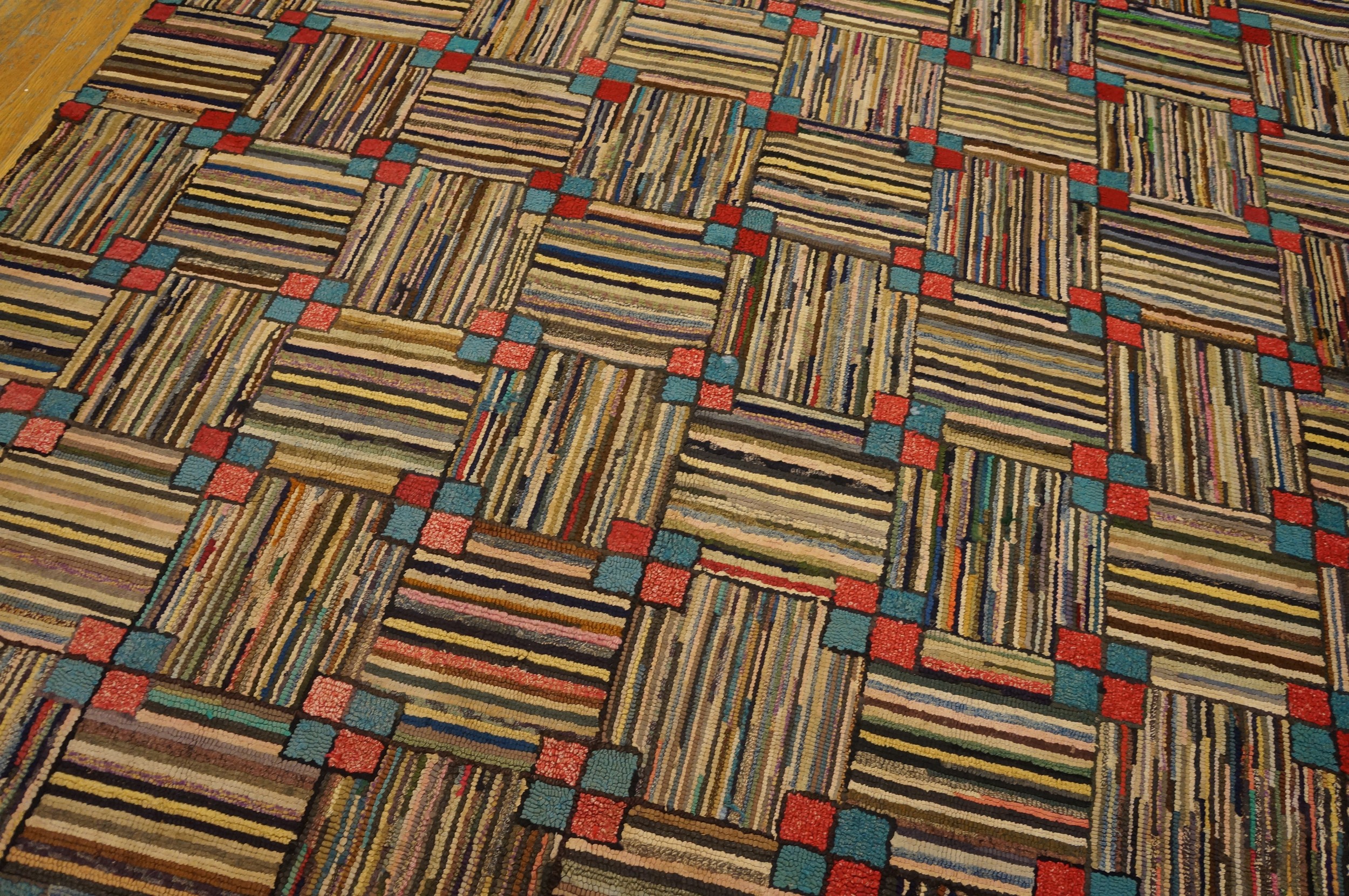 The field is dominated by a complex, interlocking grid pattern, reminiscent of a woven basket or parquet flooring. Each square within the grid is composed of densely packed, variegated wool strips, alternating between vertical and horizontal orientations to create a dynamic sense of movement and depth across the surface.