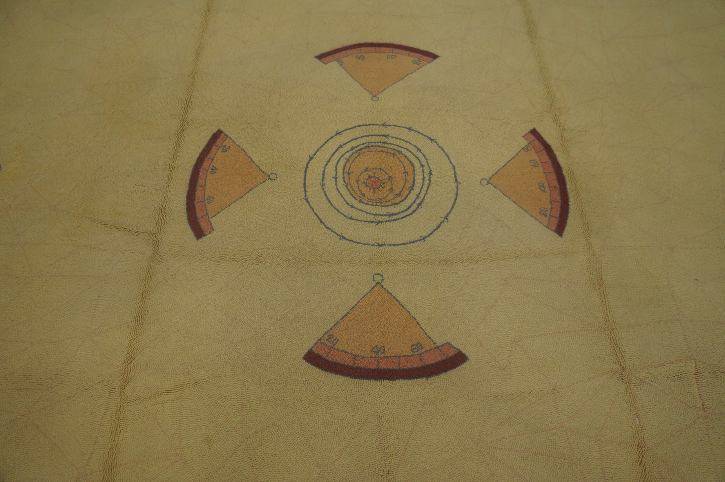 Vintage Geometric Medallion Hooked – Loop Pile Rug, Circa Date: 1950s. This exceptional American vintage area rug captures the playful yet disciplined aesthetic of mid-century design. The loop pile construction provides a soft, textural foundation, emphasizing the hand-crafted quality typical of domestic textile arts from this period.