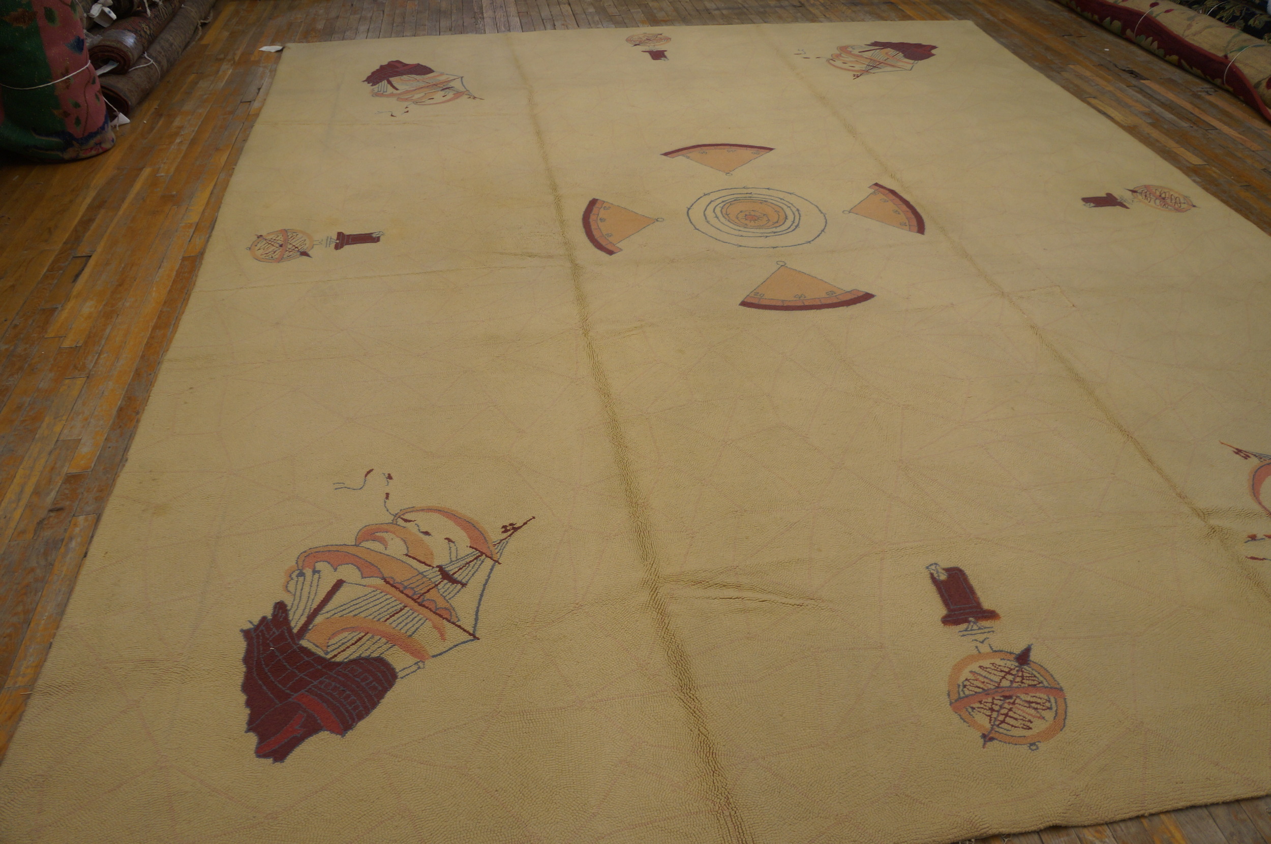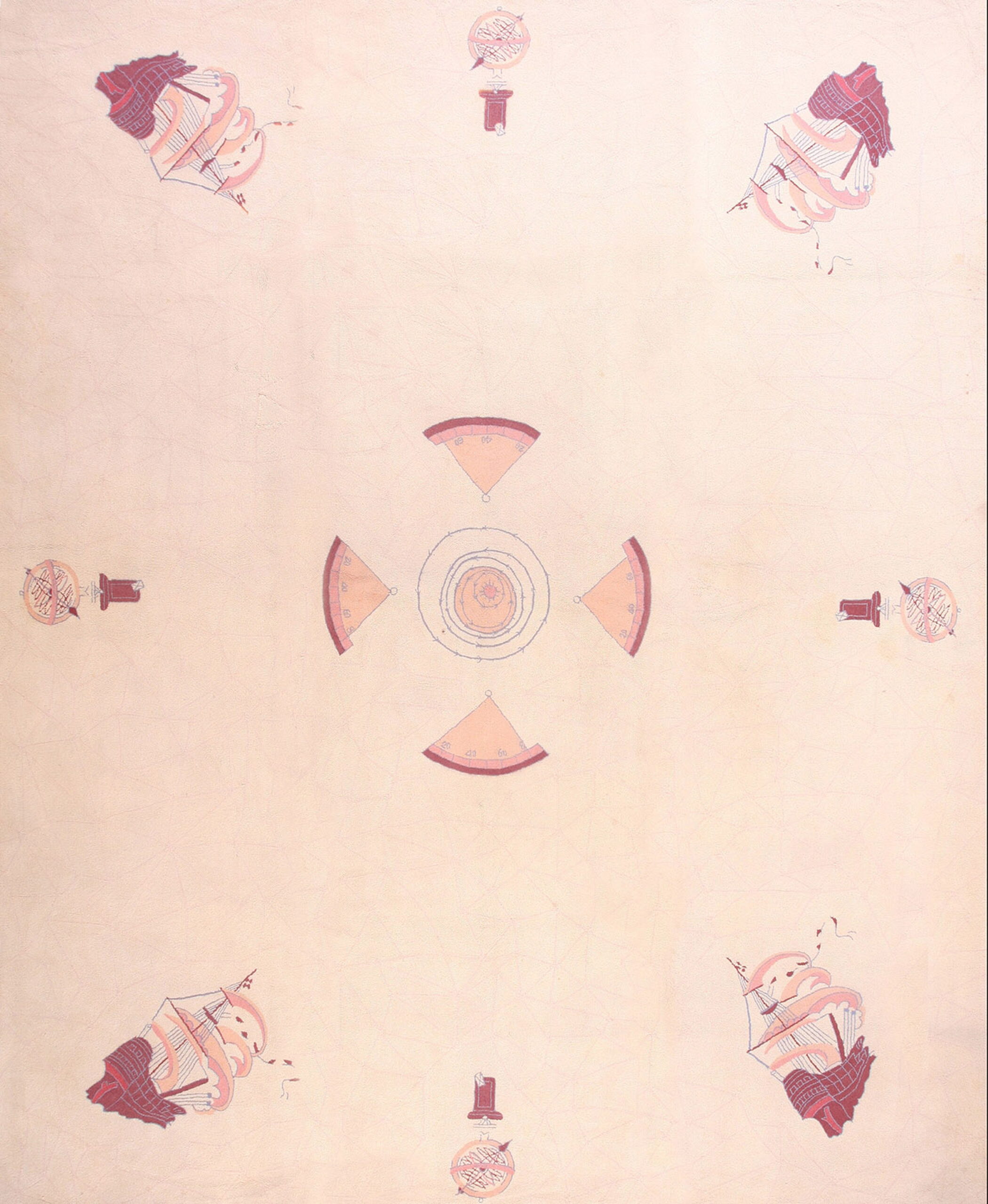 The design employs a striking central medallion flanked by highly stylized, abstract representations of sailing ships and navigational instruments. While the overall composition is balanced and symmetrical, the individual elements possess a charming, hand-drawn quality, aligning this piece firmly within the tradition of geometric rugs that prioritize form and line over dense ornamentation.
