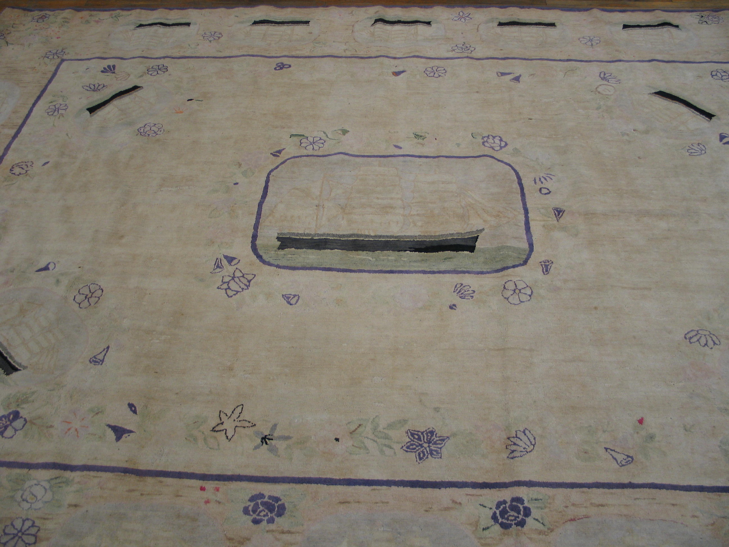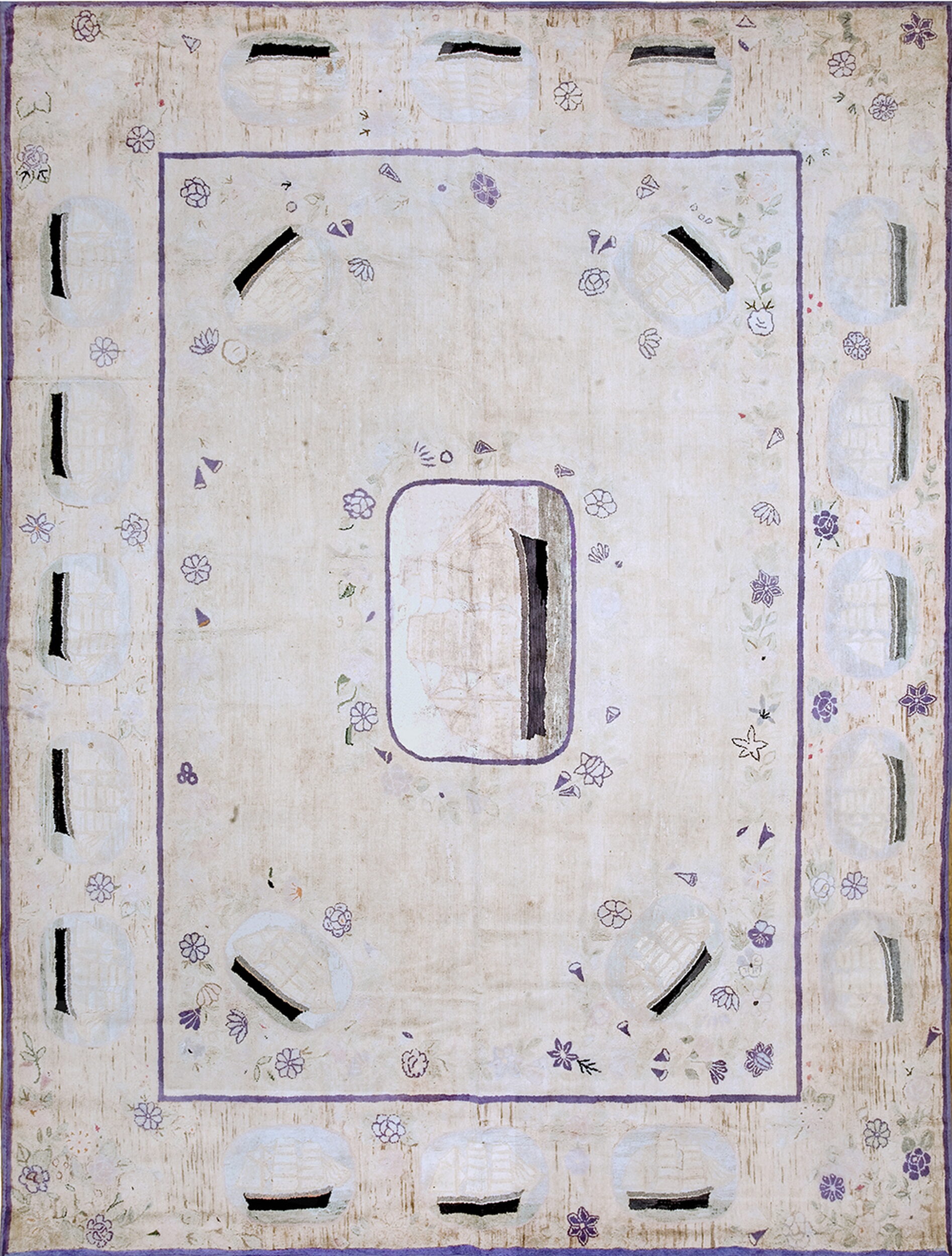 The composition is characterized by its charmingly abstract and scattered arrangement of motifs. Scattered small purple and green accents define the delicate floral rugs elements that dance across the field, contrasting with the more structured, boat-like ovals lining the interior border.