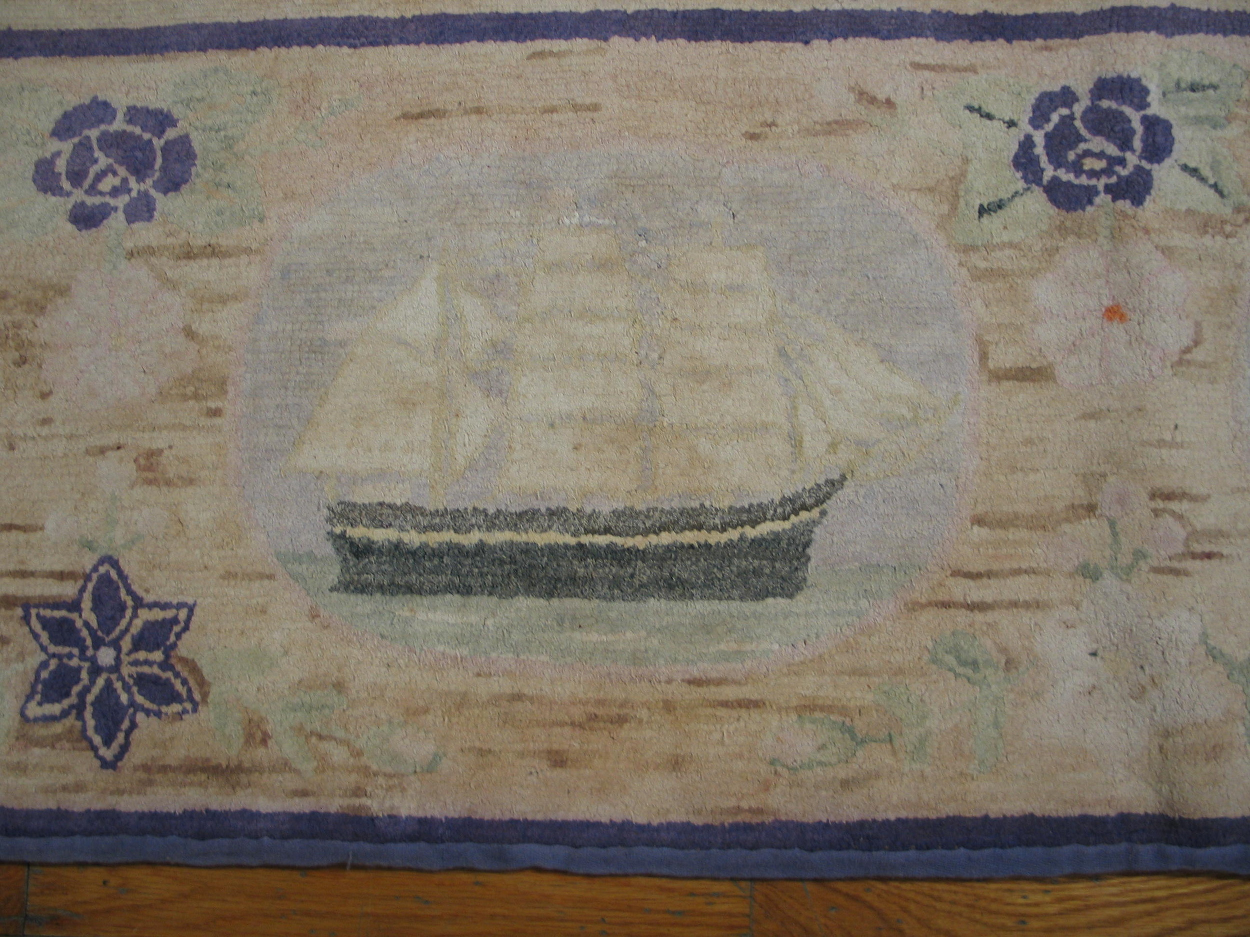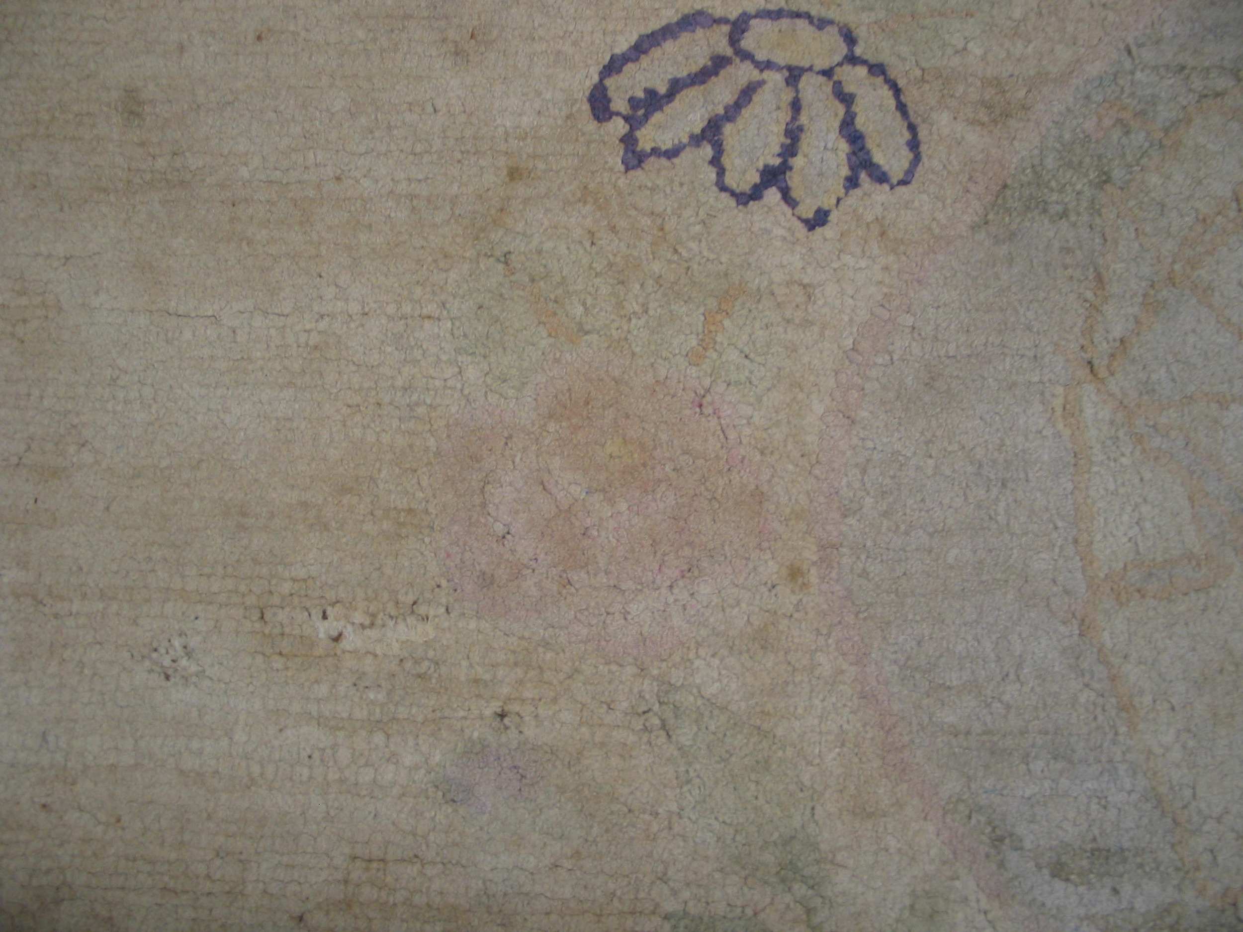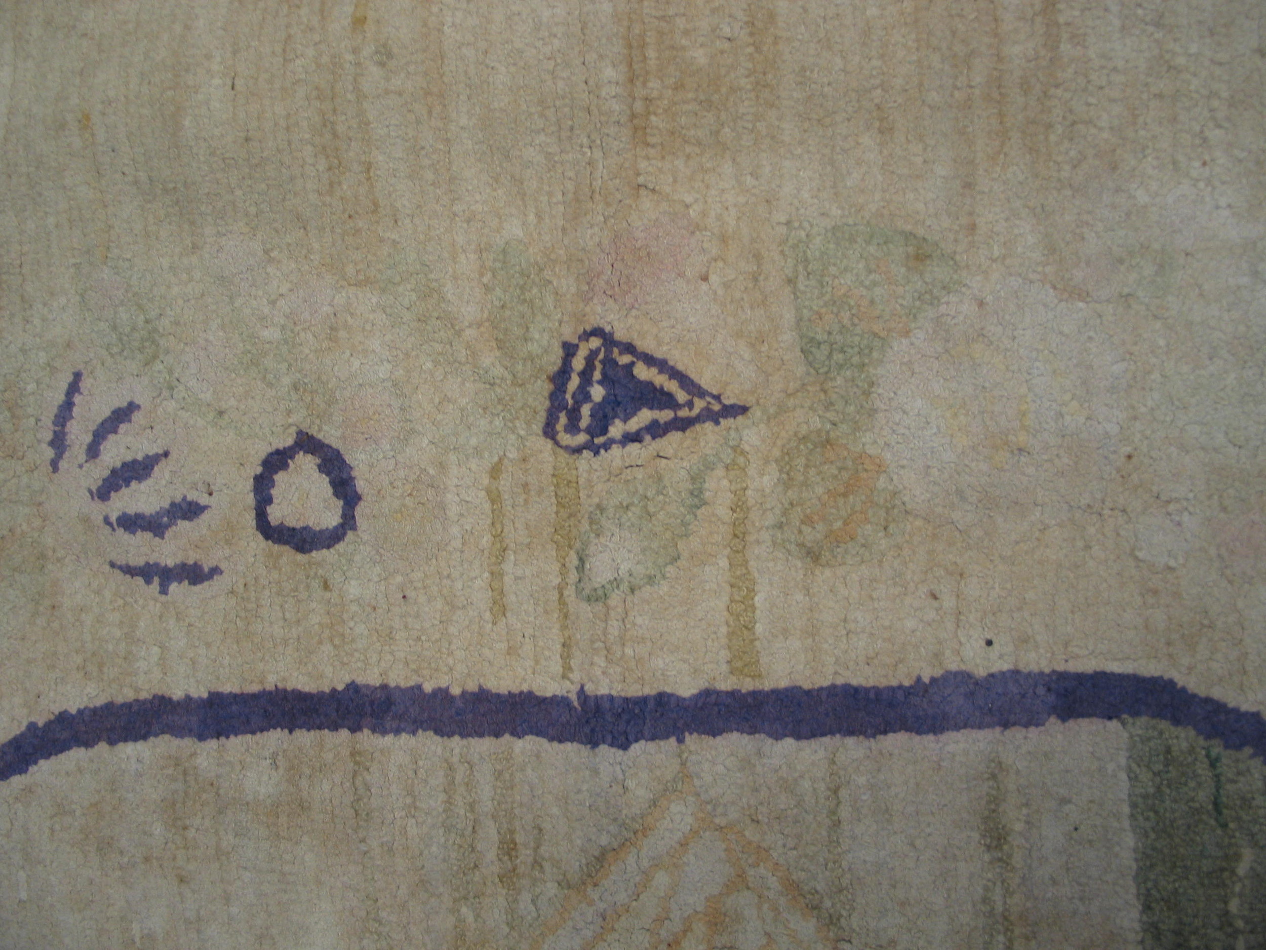 Antique American Hooked Rug Room Size Cotton Ivory, Circa Date: 1900s. This exceptional American textile piece exemplifies the creative freedom inherent in early 20th-century folk art, utilizing the robust hooked technique on a cotton foundation. It stands as a unique example among antique rugs produced domestically during this period, showcasing a distinct, naïve aesthetic.