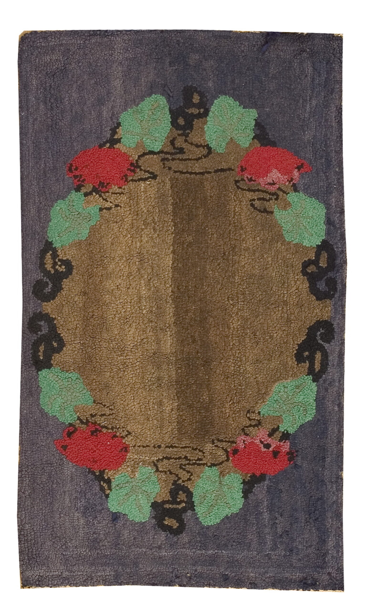 This particular style of folk art, known as American Hooked Rugs, often utilized recycled fabrics, giving each piece a unique, slightly uneven texture that speaks to its handmade origin. The central medallion, rendered in rich browns and reds, is framed by a deep, saturated indigo field.