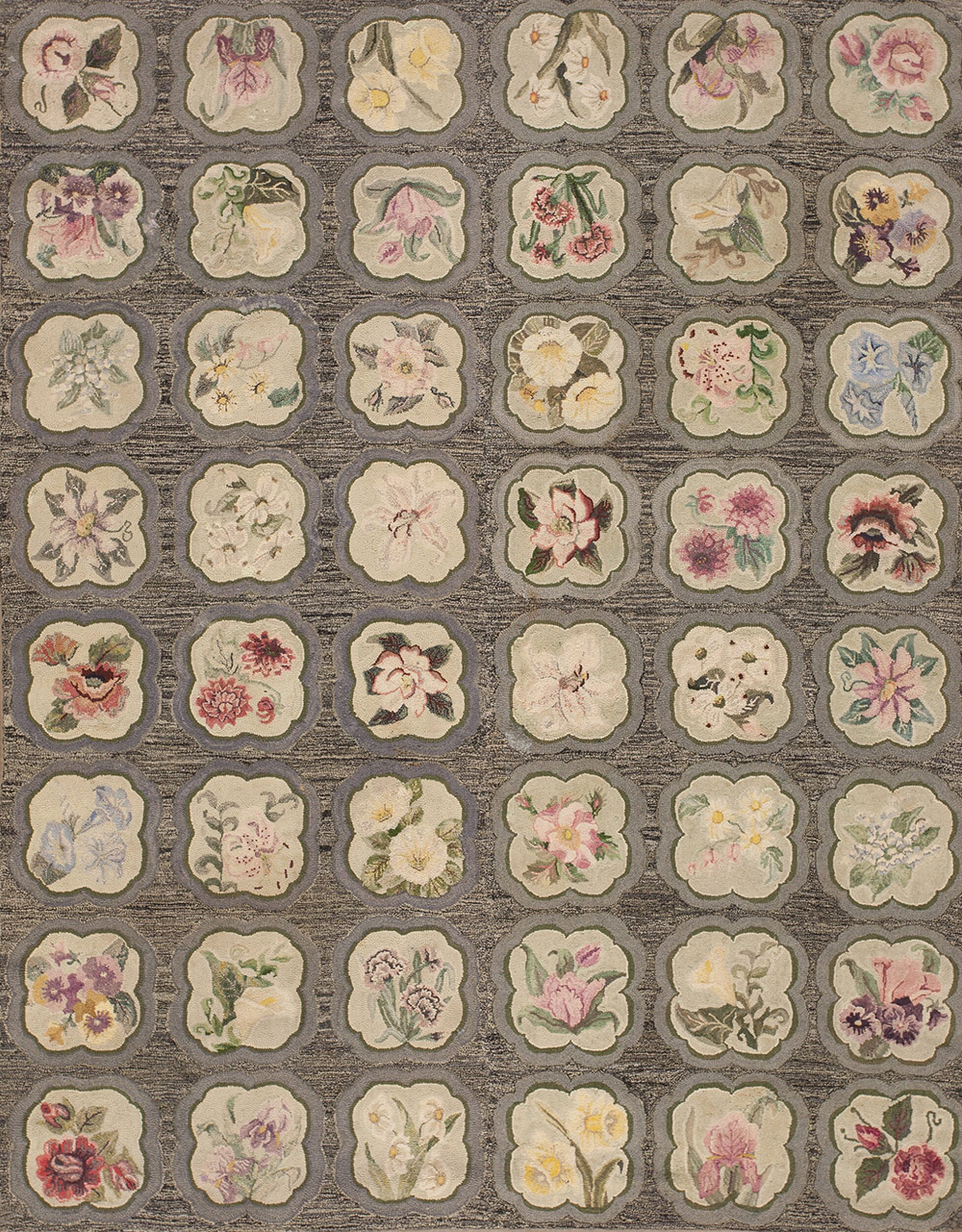 The design employs an effective juxtaposition of color and texture. Individual flowers—including roses, pansies, and lilies—are rendered in soft, faded pastels (pinks, creams, and pale blues). These delicate motifs are framed by scalloped borders and set against a dark, striated taupe background, creating a depth and definition typical of fine allover rugs.