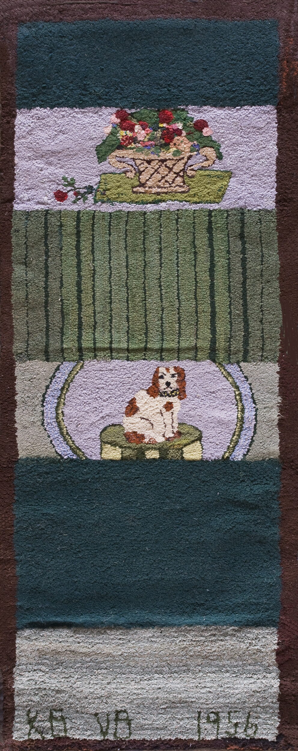 Compositionally, the rug is divided into distinct vertical compartments, moving away from the typical structure of allover rugs. Key figurative elements include a central oval medallion featuring a spotted dog figure, balanced by a richly detailed basket of flowers toward the opposing end, lending the piece a distinctly narrative quality.