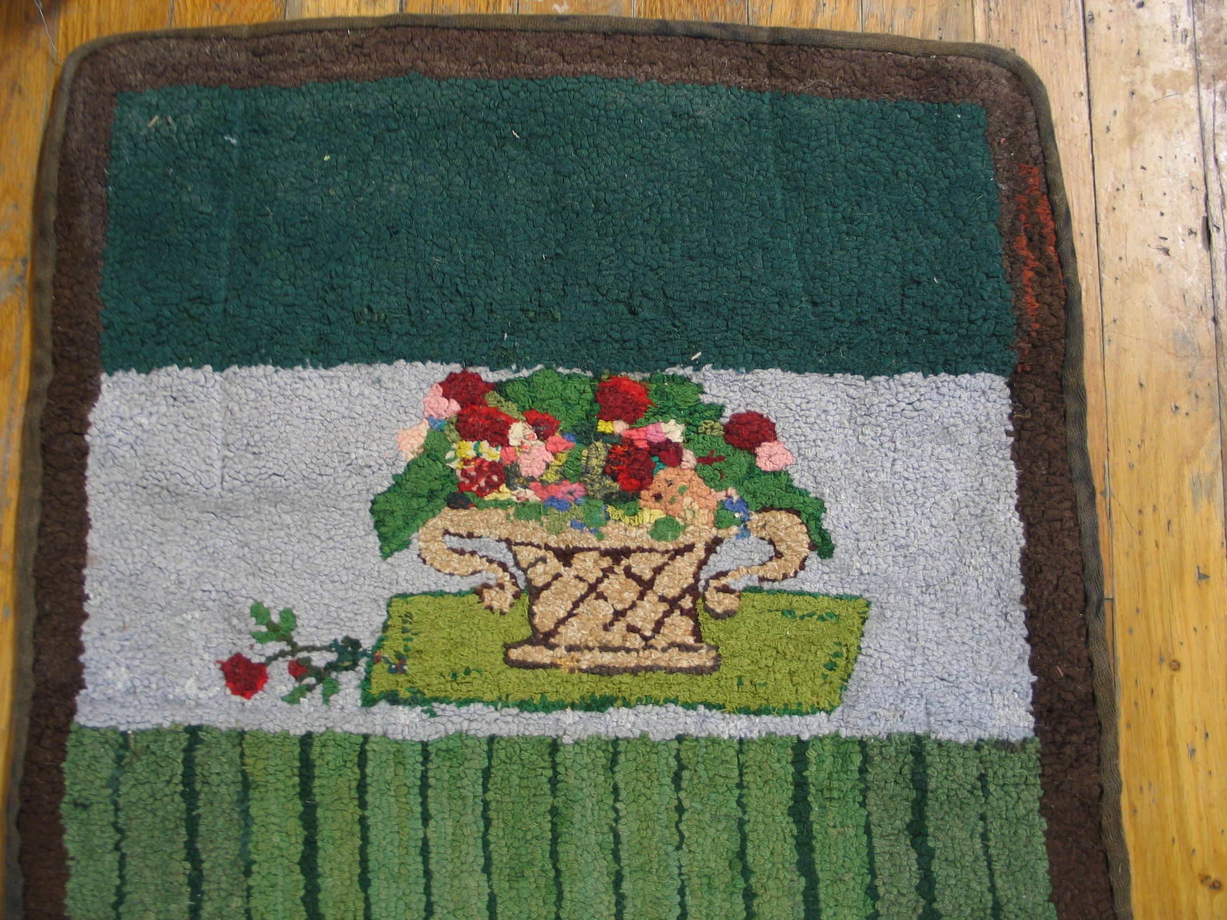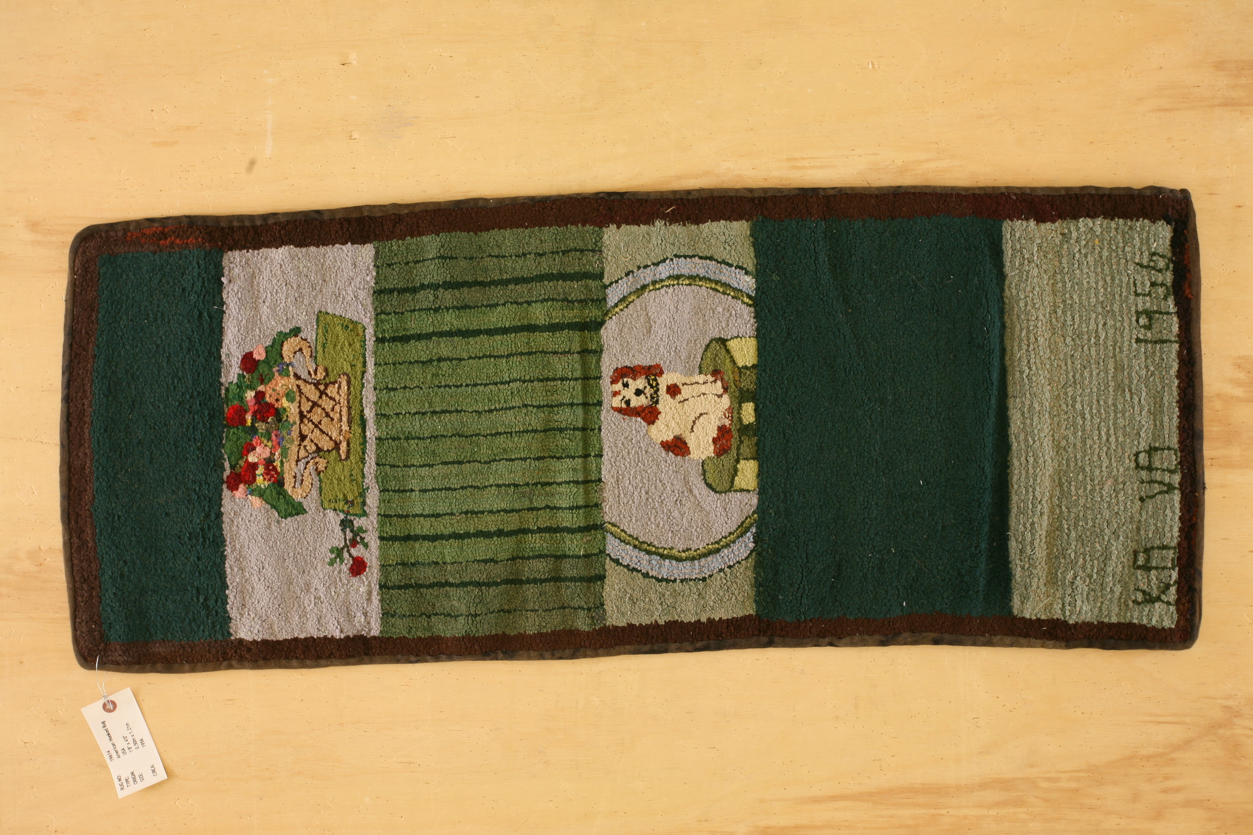 Vintage American Hooked Rug Small Scatter Size Wool Green, Circa Date: 1956. This charming mid-century textile represents the enduring tradition of American folk craft, executed in robust hooked wool. Its specific dimensions classify it as a small scatter size rugs, making it an ideal accent piece for a hallway, bedside, or entryway.