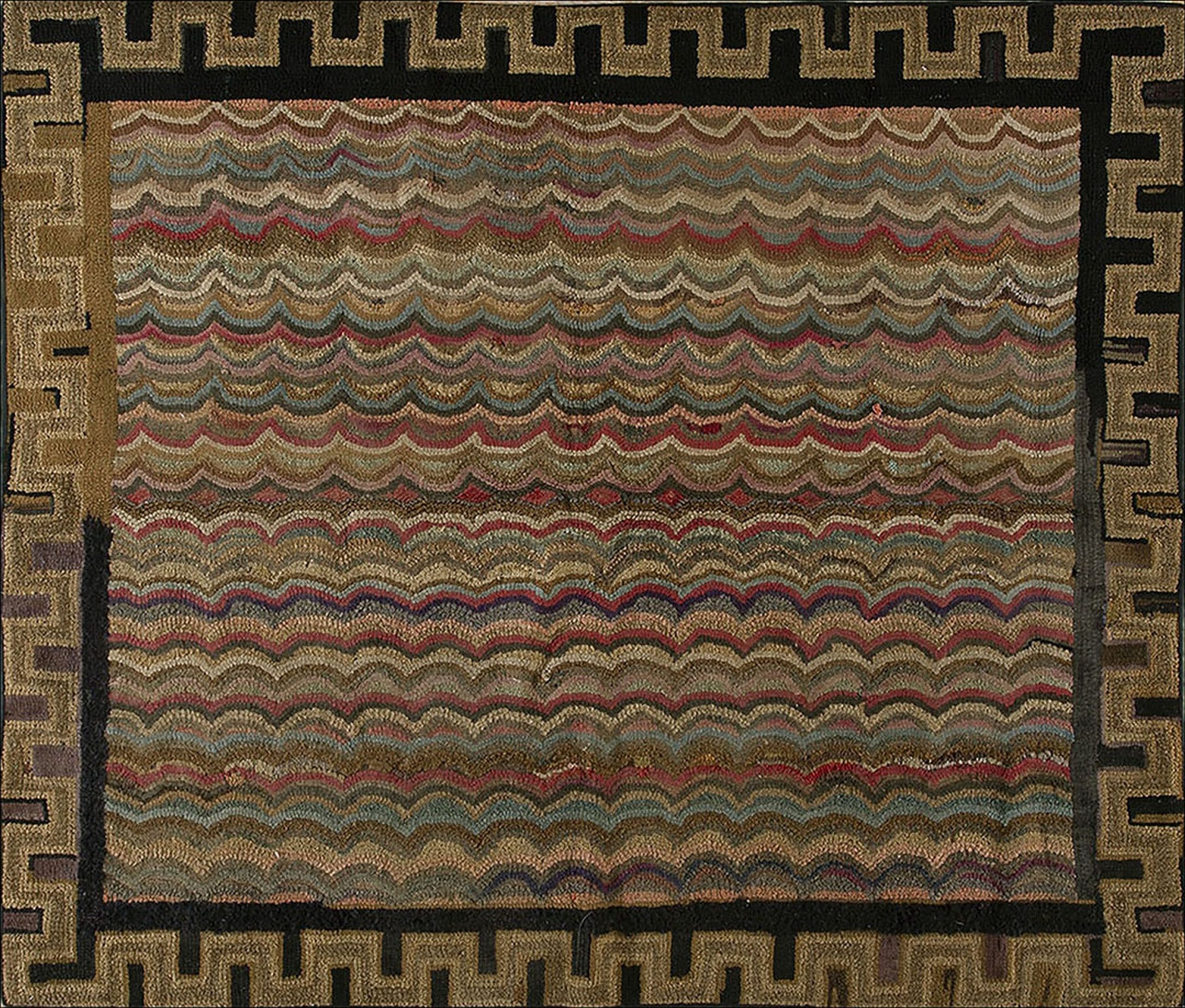 Dating to the 1890s, this example features a fascinating central field composed of undulating, horizontal rows, evoking the movement of water or rolling hills. This organic design contrasts sharply with the strong, architectural geometry of the border. The wide frame is executed in a classic Greek Key or meander pattern, rendered in bold black and earthy tan tones, providing a sophisticated structure to the folk-art aesthetic.