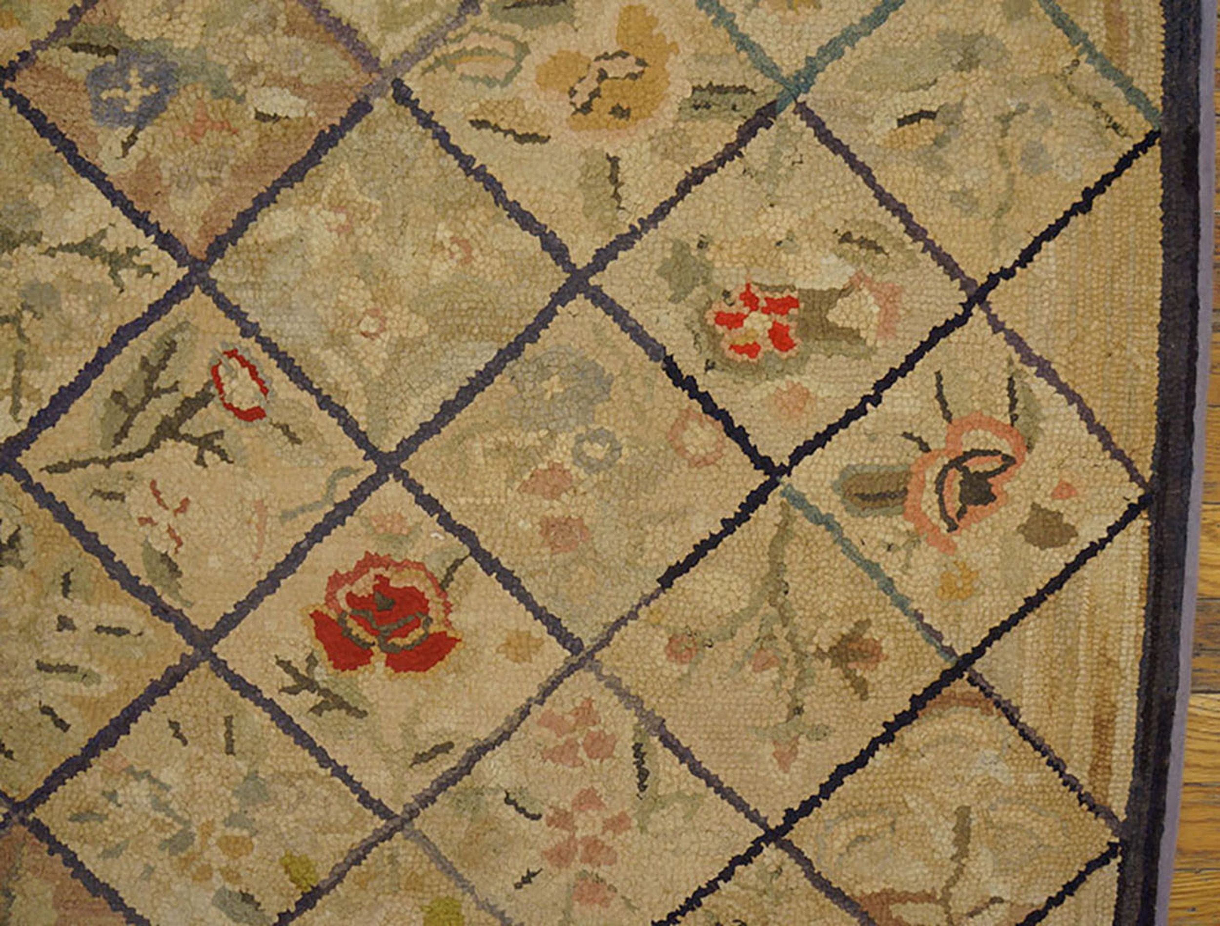 Antique American Hooked Allover Floral Rug, Circa Date: 1930s. This charming textile exemplifies the domestic artistry characteristic of American Hooked rugs during the early 20th century. Crafted with wool loops, the texture provides a soft, dimensional surface that speaks to its handmade origin and enduring quality.