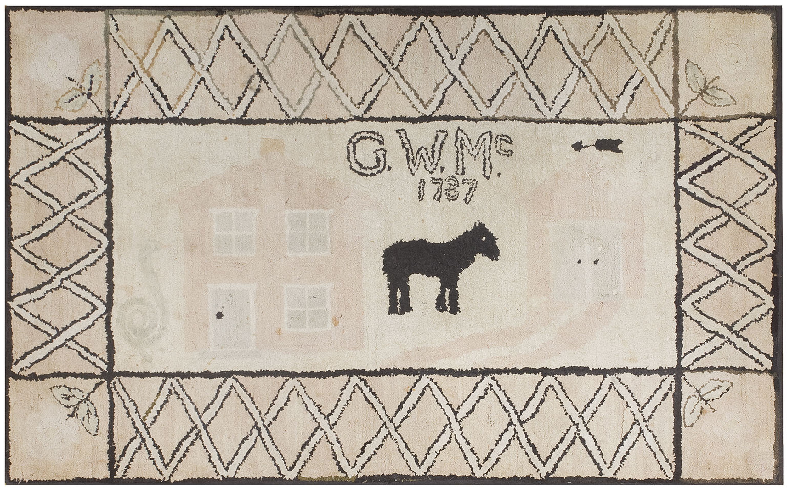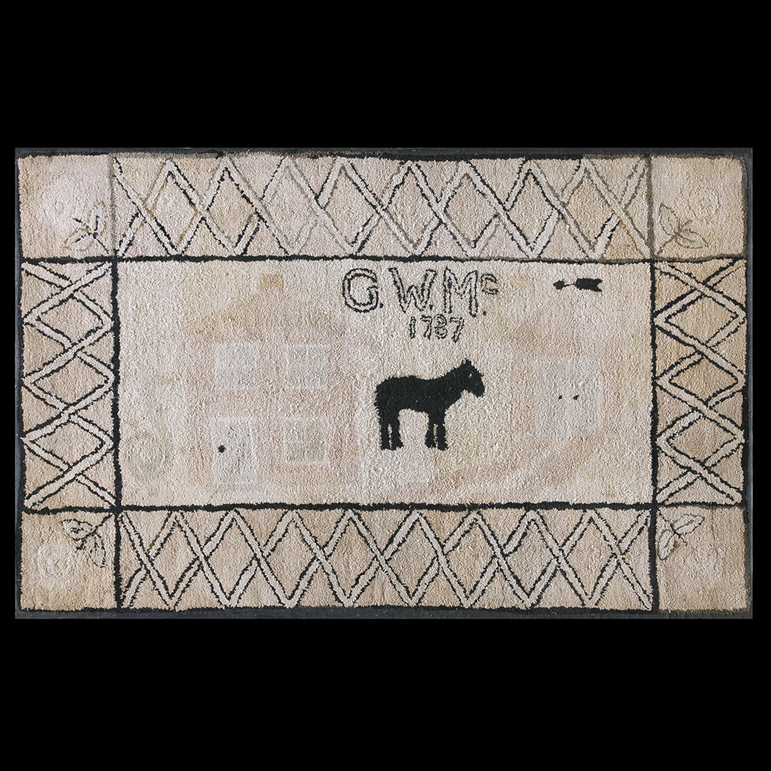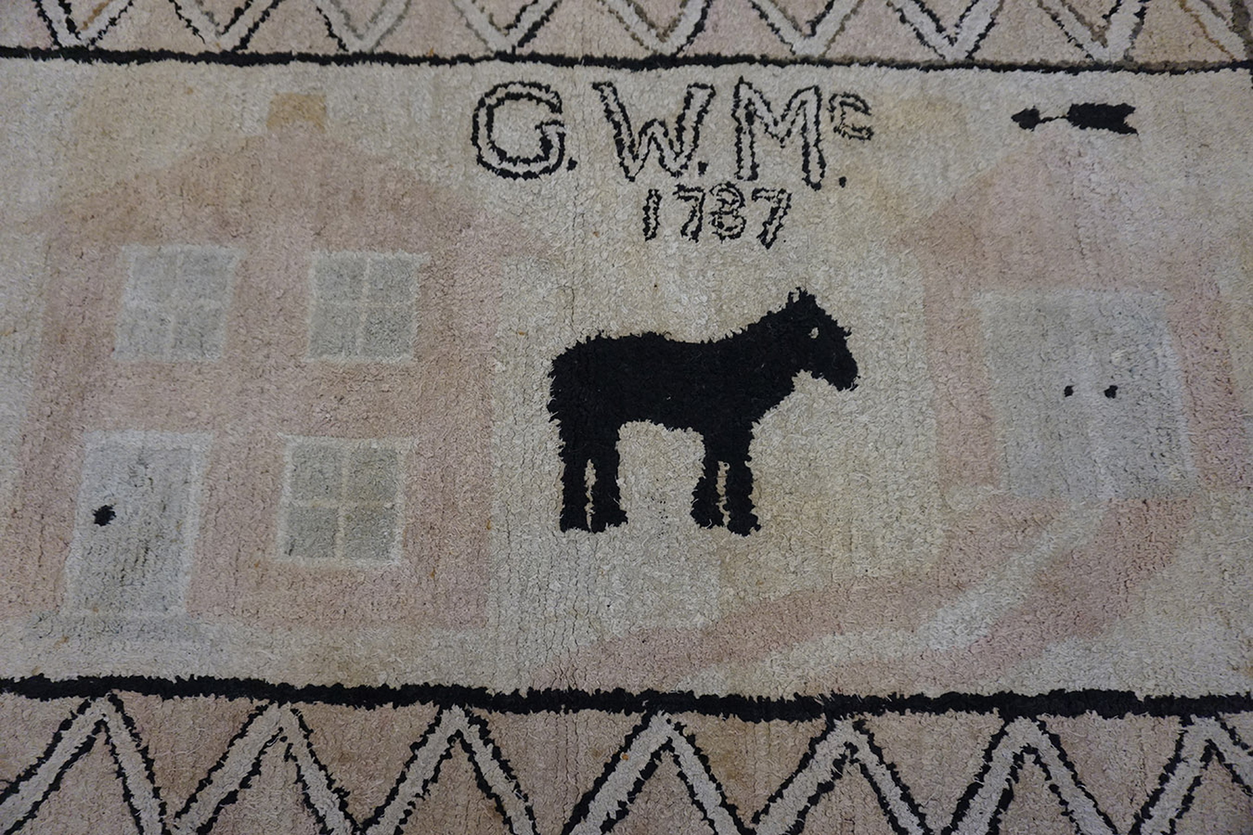 The field presents a delightful, naive scene rendered primarily in warm ivory beige tones, providing a soft, neutral canvas for the central motifs. Dominating the composition are a stylized house and a dark, silhouetted horse, elements often associated with pastoral American life and domestic history. The inclusion of initials and a date (G.W.M. 1787) suggests a deeply personal or commemorative function for this unique textile.