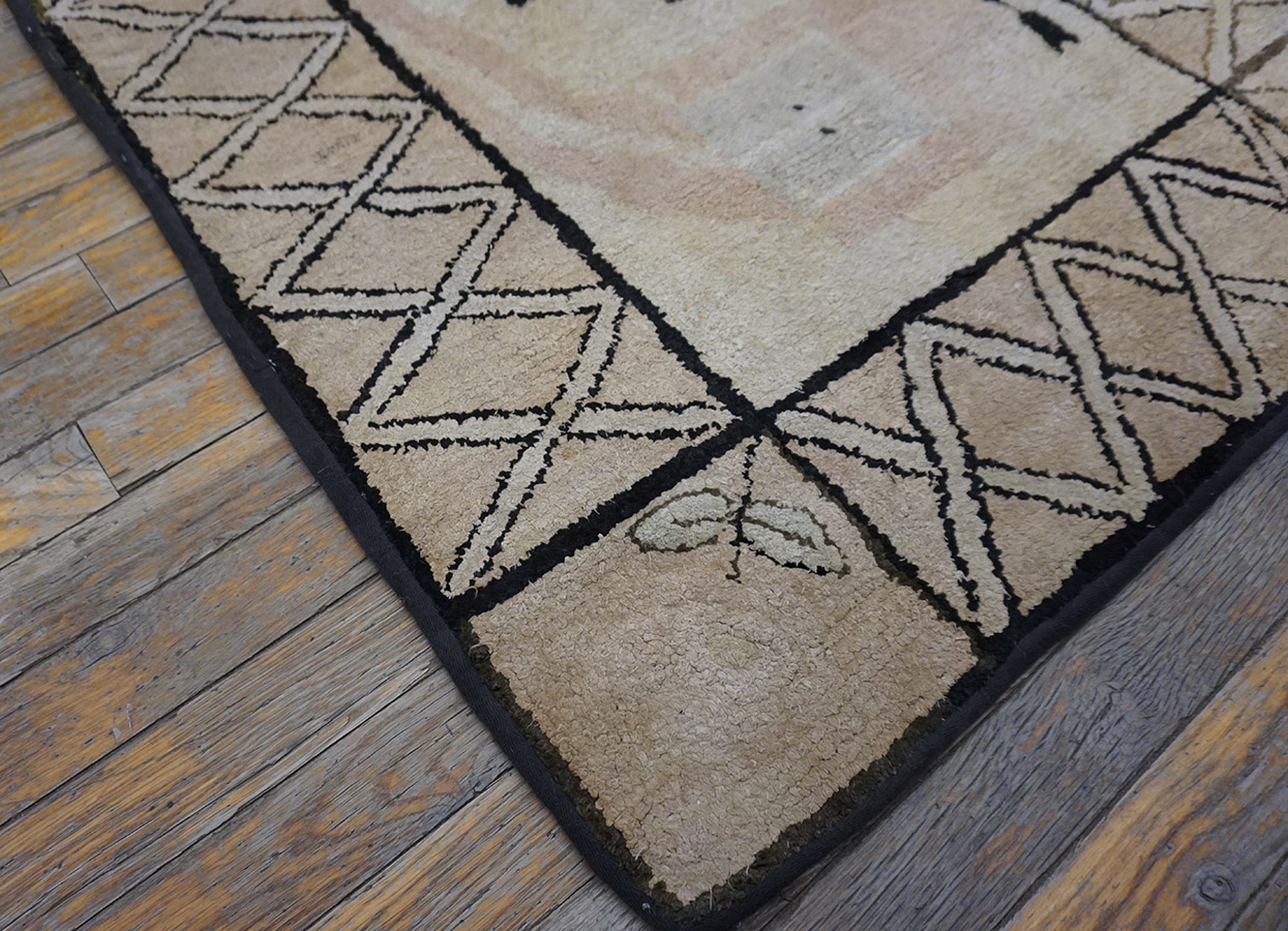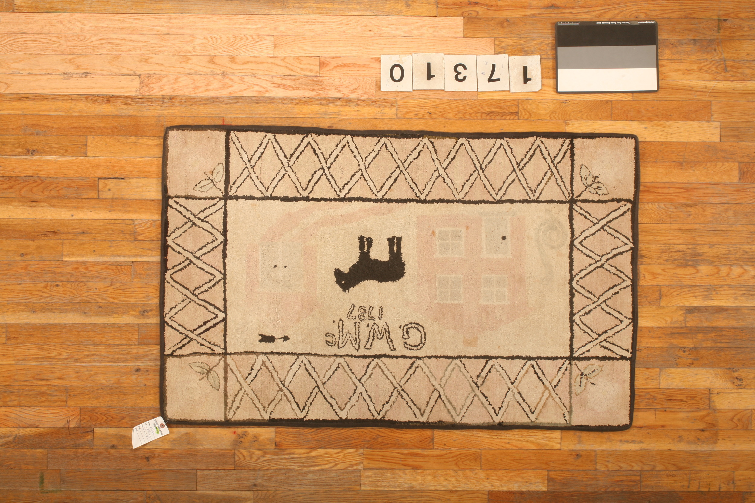 Antique American Hooked Wool Ivory Beige Cream White Rug, Circa Date: 1930s. This exceptional example of folk art textile design captures the charming, narrative quality typical of American hooked rugs from the early 20th century. Its construction utilizes traditional hooking techniques, resulting in a dense, textural surface that emphasizes the handcrafted nature of the piece.