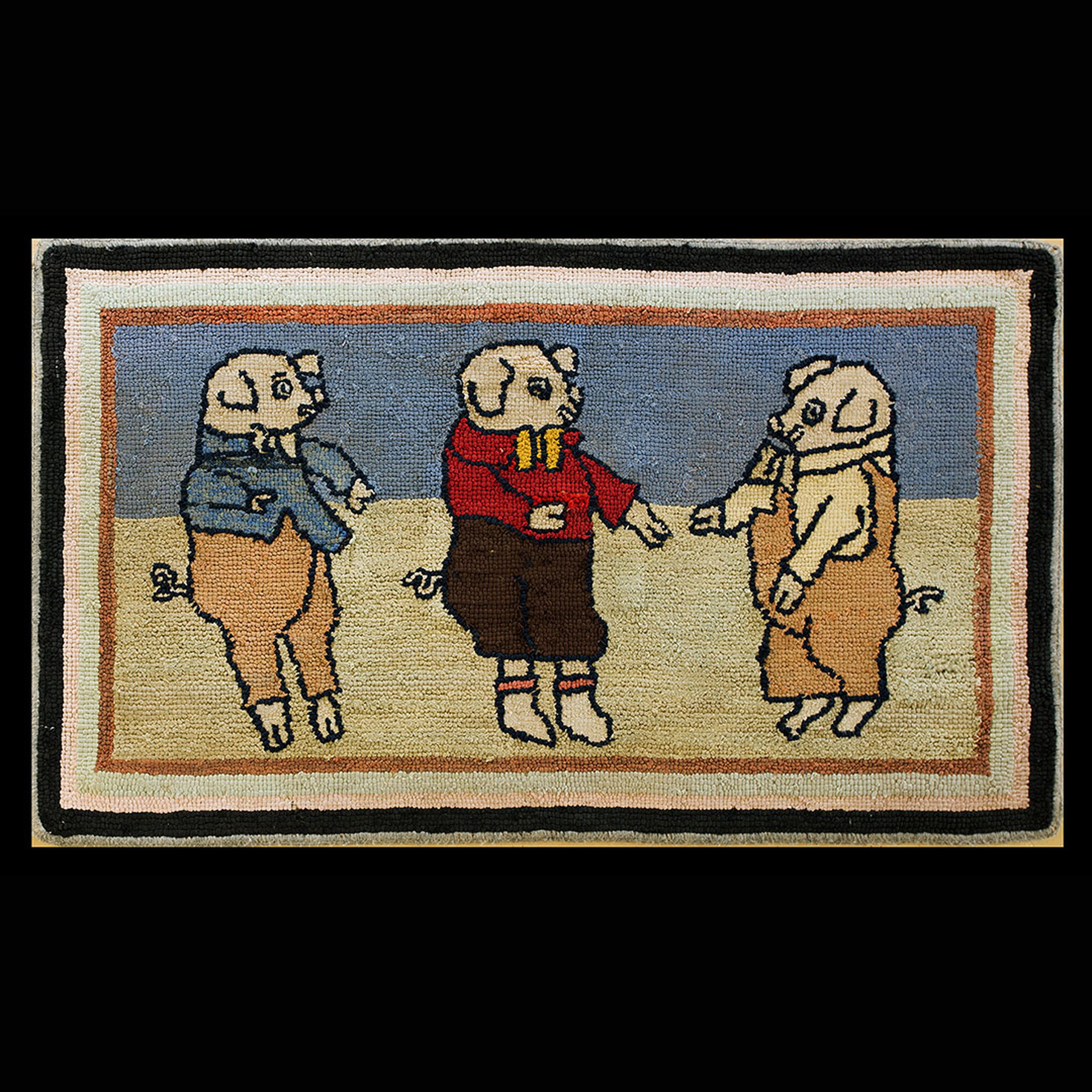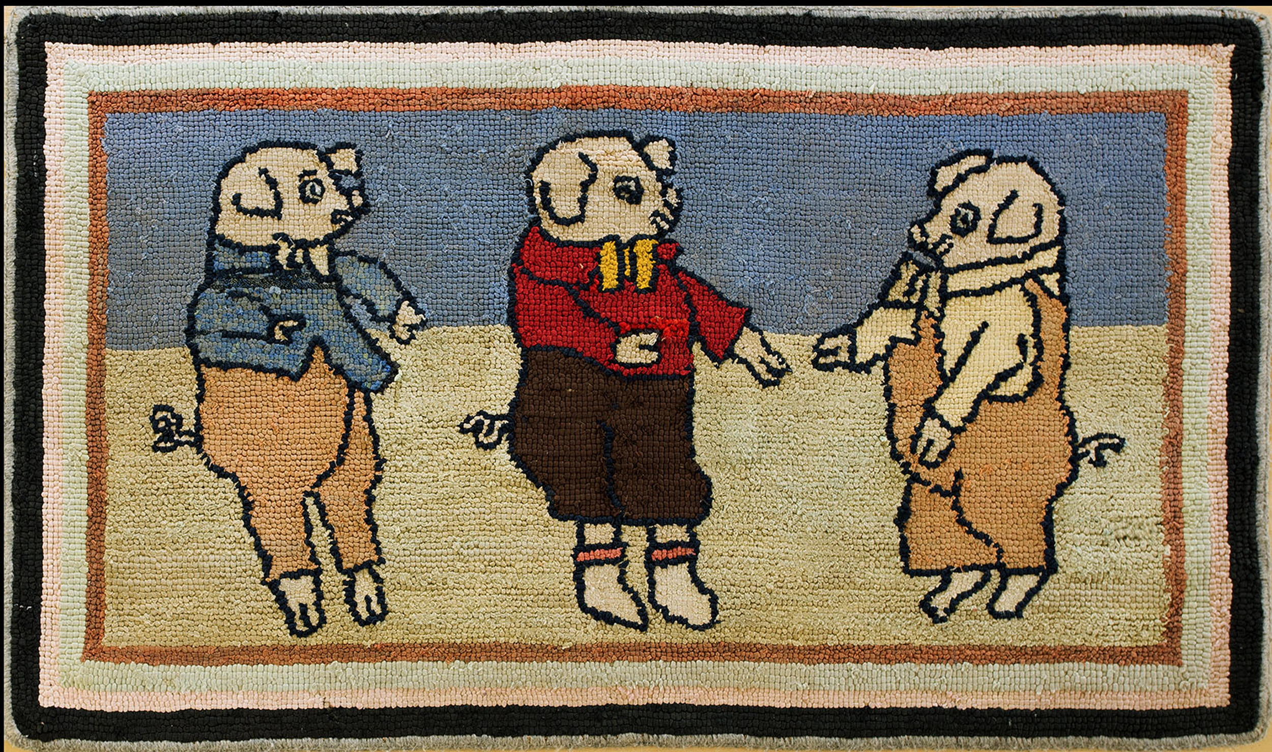Antique American Hooked Wool Multicolor Small Scatter Size 1920s 3 Little Pigs Rug, Circa Date: 1920s. This charming and highly collectible textile represents the enduring folk art tradition of the early 20th century. Its dimensions place it perfectly within the category of a small scatter size rug, ideal for adding a focal point of color and narrative interest to a small space.