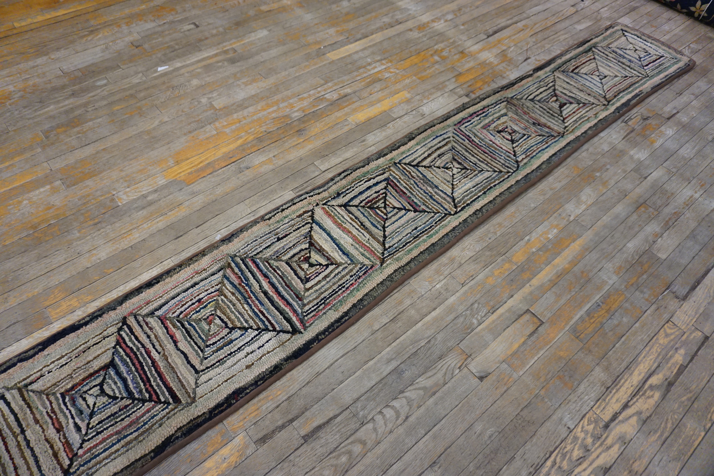 The distinctive texture is achieved through the loop-and-hook method, creating a dense, durable pile that speaks to its domestic, handcrafted origins. This particular example of an American Hooked Rug features a repeating geometric pattern of concentric squares, rendered in a striking, slightly variegated palette that emphasizes the handmade nature of the material.