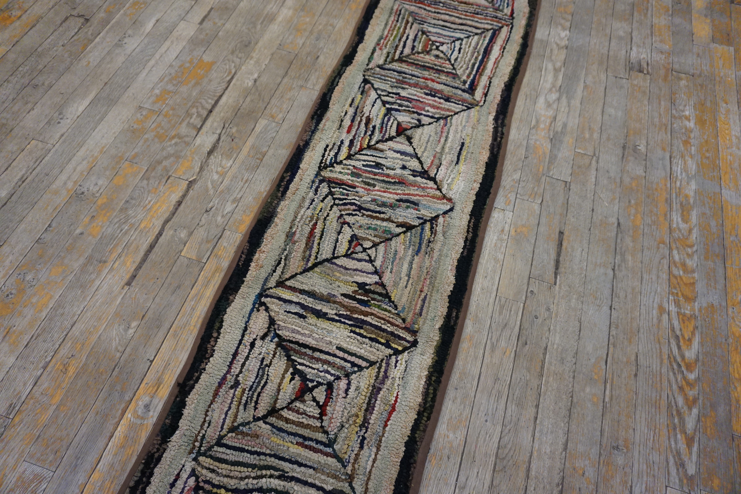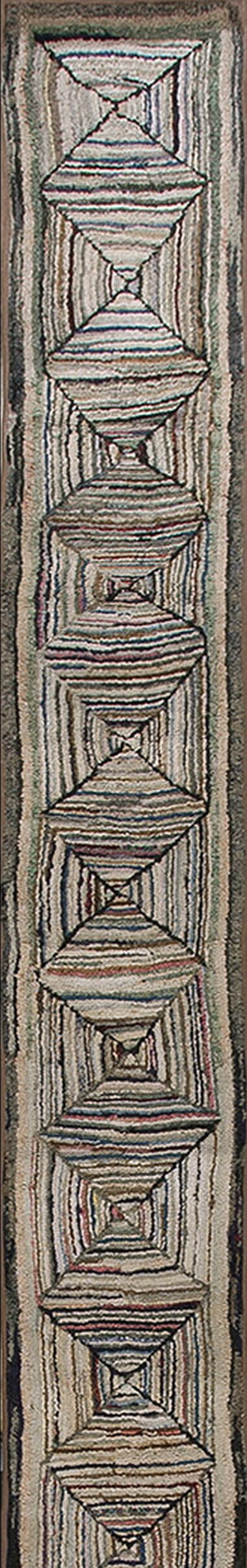 Antique American Hooked Rug Hallway Runner Cotton Ivory, Country of Origin: American USA Rugs, Circa Date: 1900s. This exceptional piece represents the finest tradition of textile craft originating from the American USA Rugs movement. Its construction utilizes repurposed cotton and wool remnants, characteristic of early 20th-century folk art, lending it a unique depth of texture and history.