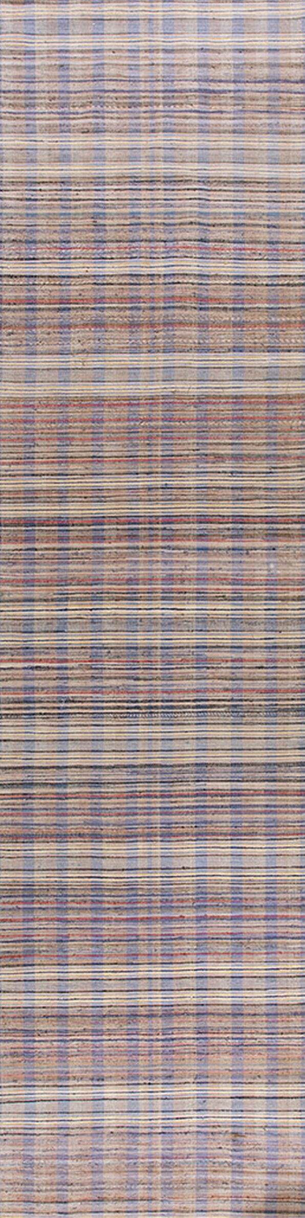 Constructed using a flat-weave technique, the rug’s surface is durable and low-profile. The design avoids a central medallion, instead relying on the continuous, repetitive structure of the stripes. This ensures the pattern extends uniformly across the entire field, classifying it as an allover rug design, suitable for defining long, narrow spaces.