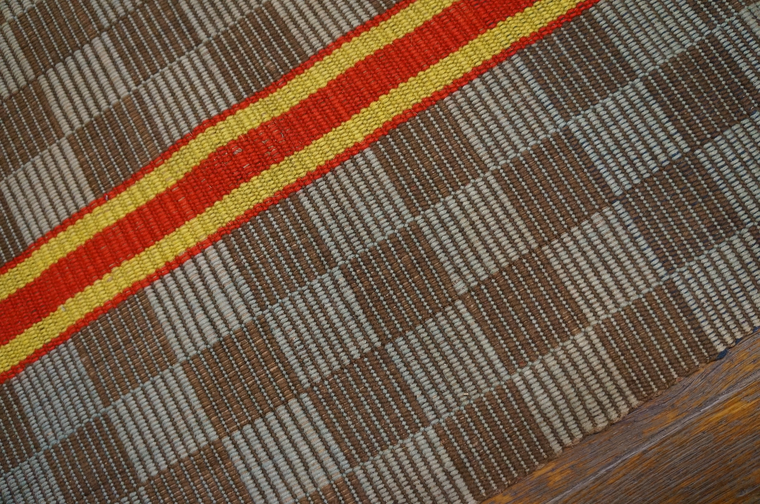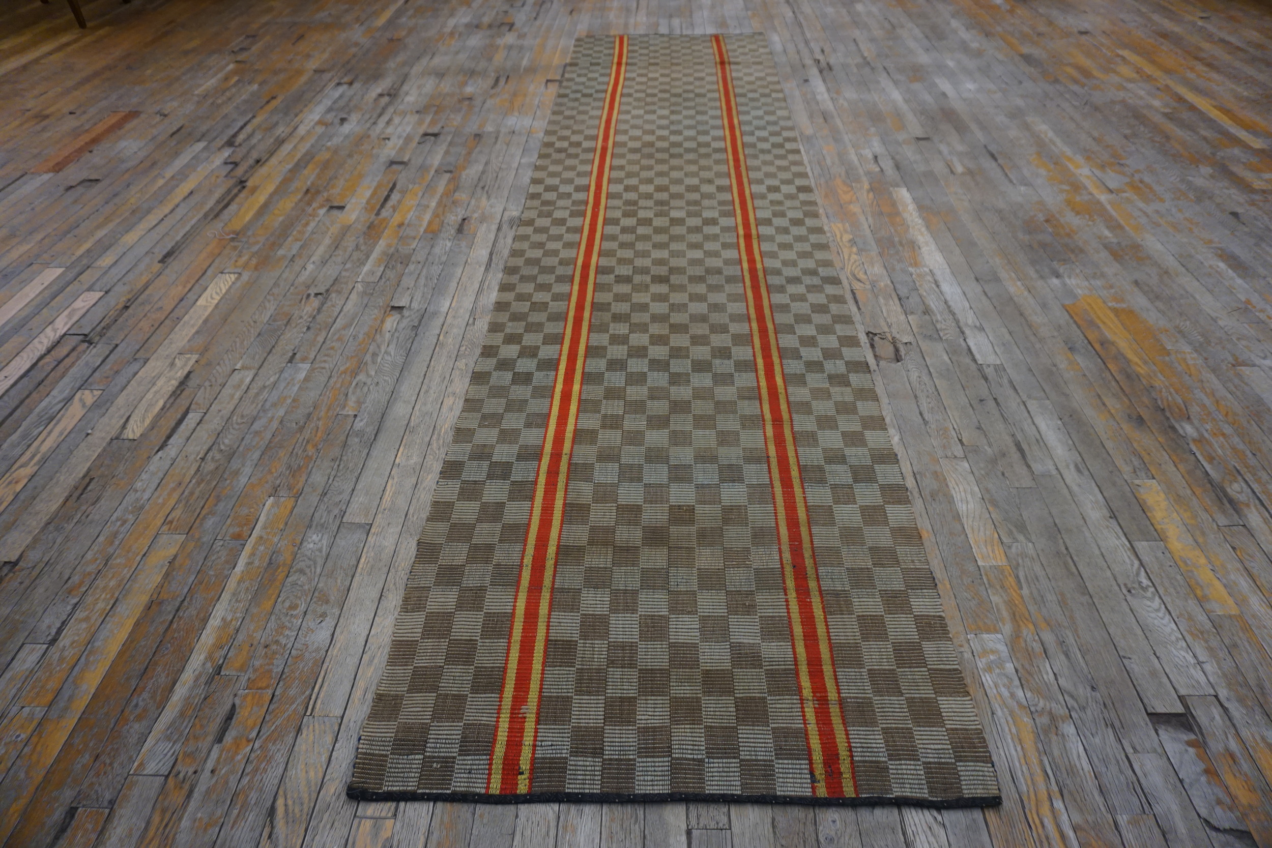 Given its elongated and narrow dimensions, this textile was clearly intended as a hallway runner rug, perfectly suited for architectural spaces requiring linear definition. The enduring quality and graphic simplicity of this American flat weave make it a highly desirable acquisition for collectors valuing historical textile craftsmanship and clean, period design.