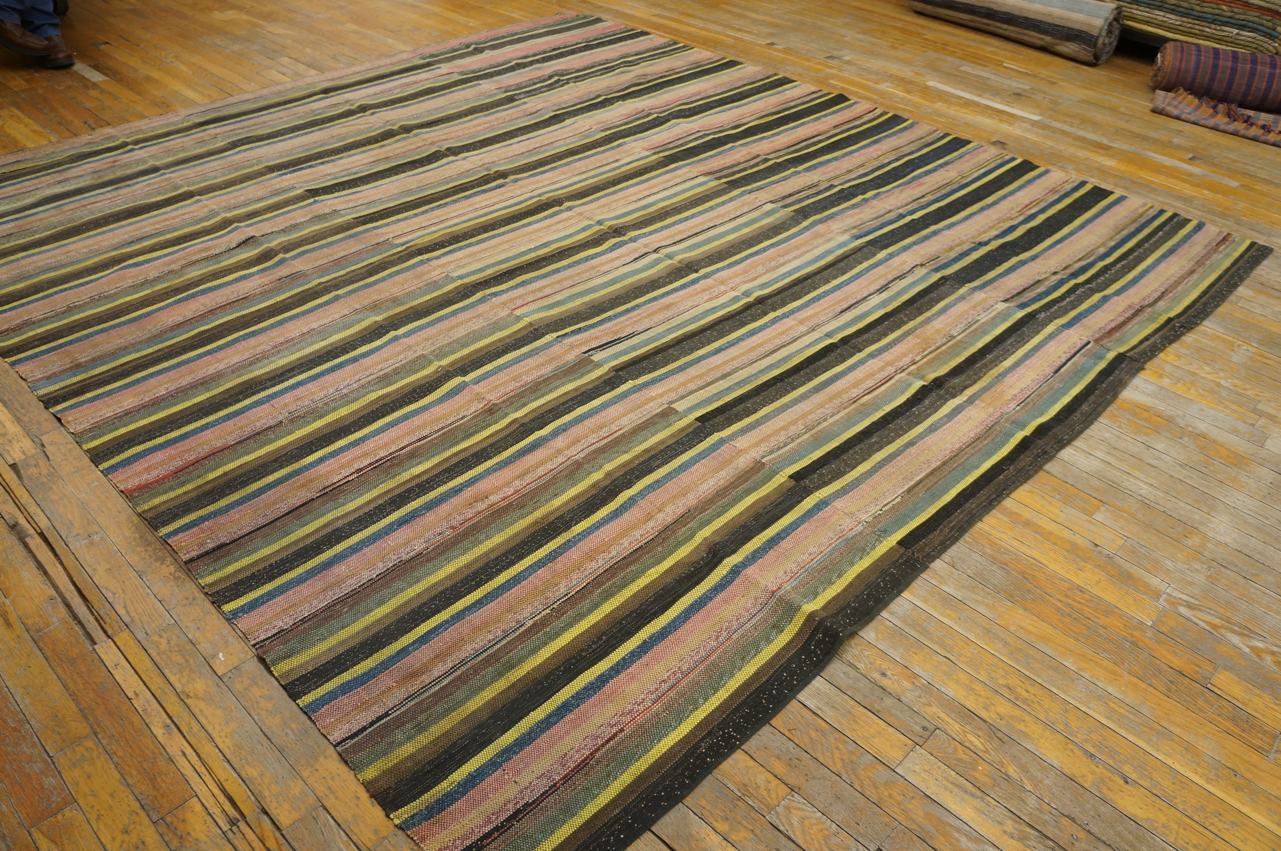 Given its construction from multiple vertical panels stitched together, the scale of this piece suggests it was intended for a prominent space, perhaps serving as a substantial room-size rug in a farmhouse or large parlor. The inherent durability of the tightly woven rag material ensured its longevity, allowing the vibrant, if slightly faded, palette to endure over 140 years.