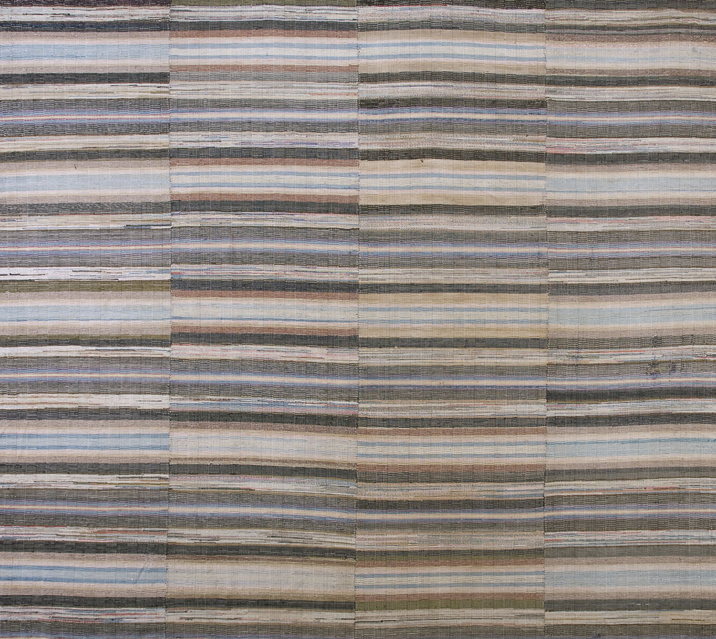 The design features a compelling, horizontally striped pattern composed of variegated tones—soft blues, taupes, creams, and deep grays—that shift subtly across the field. While often simple in construction, the resulting texture creates a sophisticated, almost painterly effect, offering an allover design that integrates seamlessly into contemporary or traditional interiors.