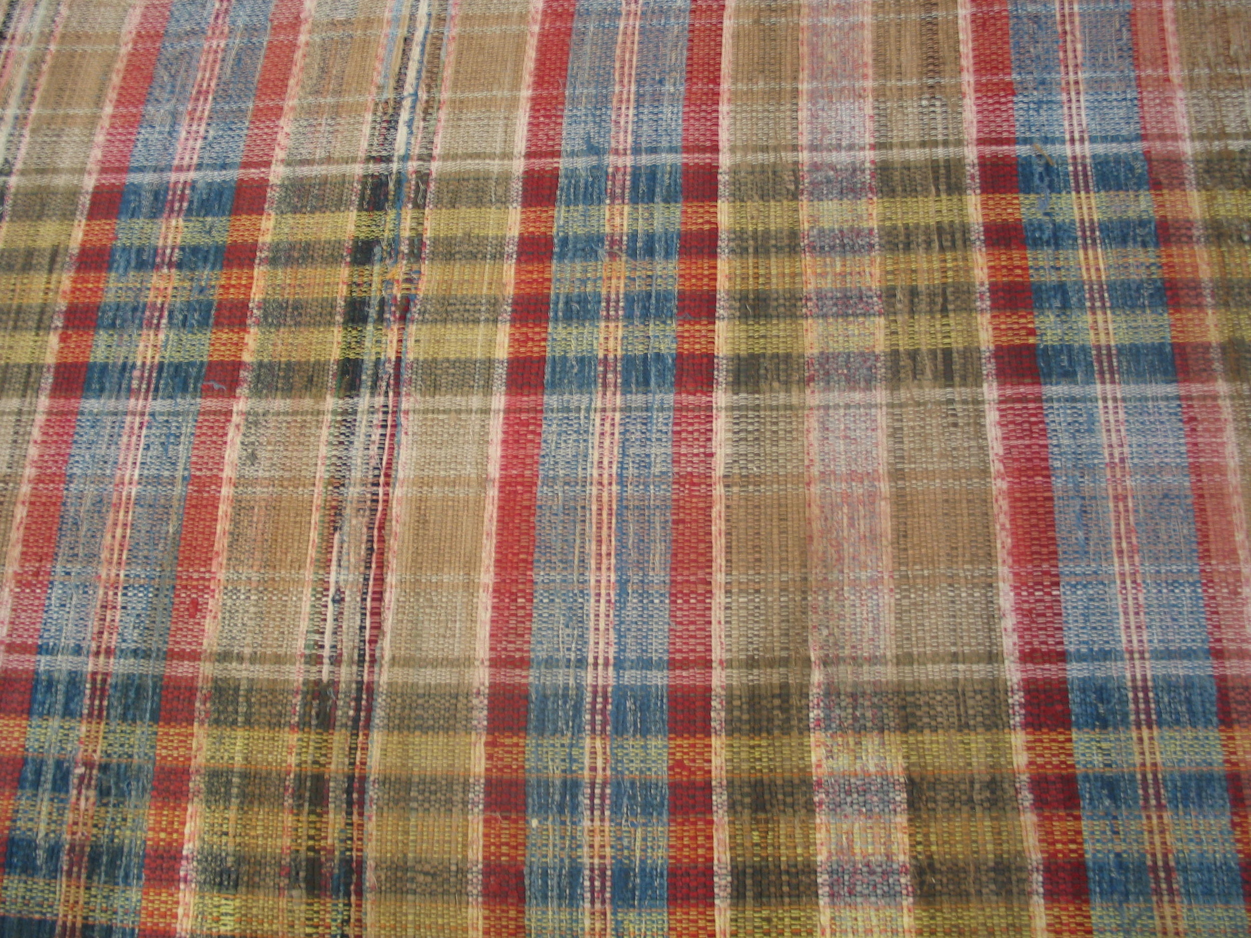 The composition features an engaging, almost plaid-like structure created by the interplay of warp and weft threads. The palette is surprisingly vibrant yet softened by age, incorporating muted reds, corn yellows, and gentle blues against a neutral, earthy ground. This harmonious blend of hues makes it a standout example among multicolor jewel tone rugs of the era, offering visual depth without overwhelming a space.