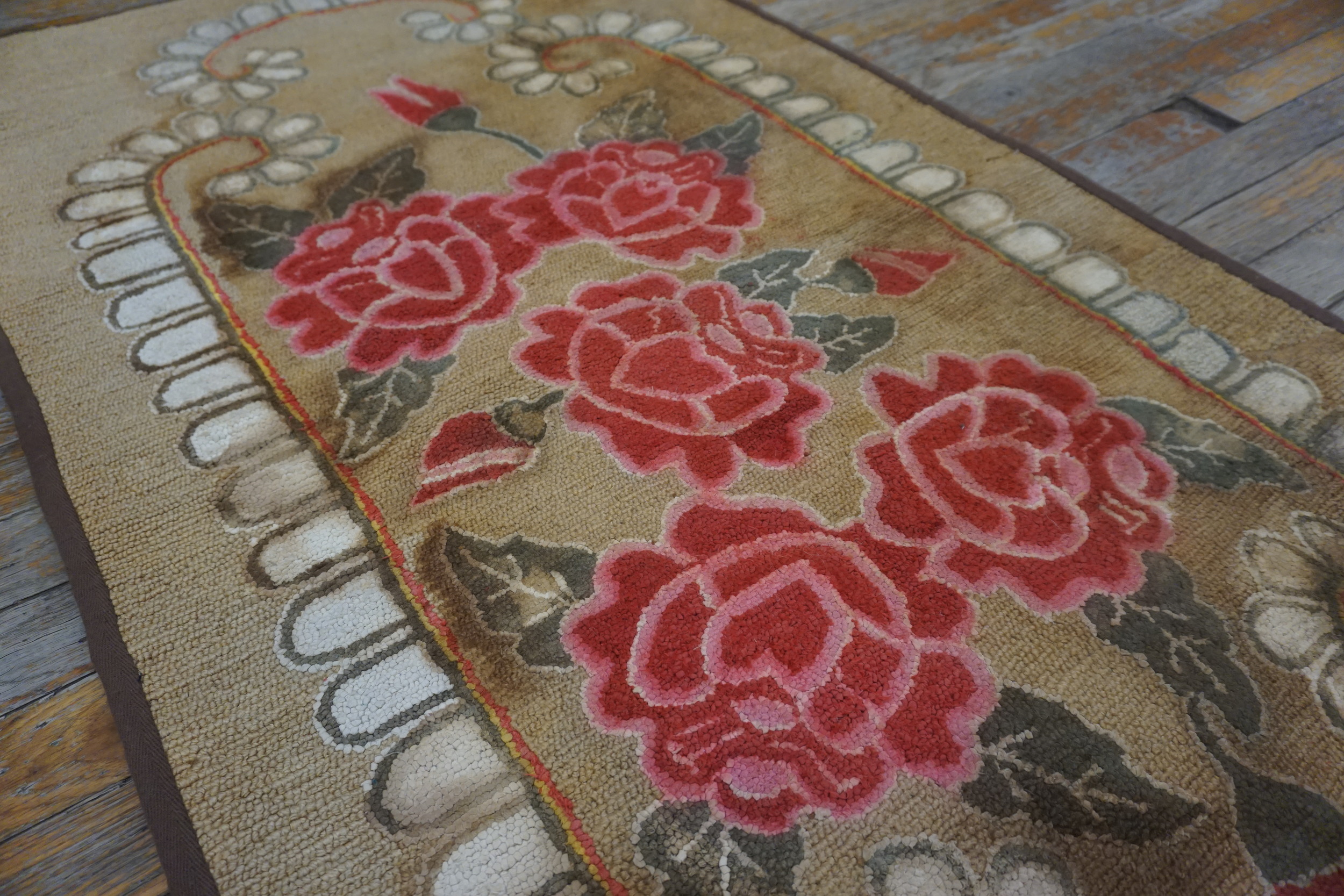 Antique American Hooked Rug Small Scatter Size Jute & Cotton Brown, Circa Date: 1935. This charming American hooked example represents the tradition of folk art textiles popular during the Depression era. Crafted from durable jute and cotton fibers, it is a quintessential piece among our collection of antique rugs.
