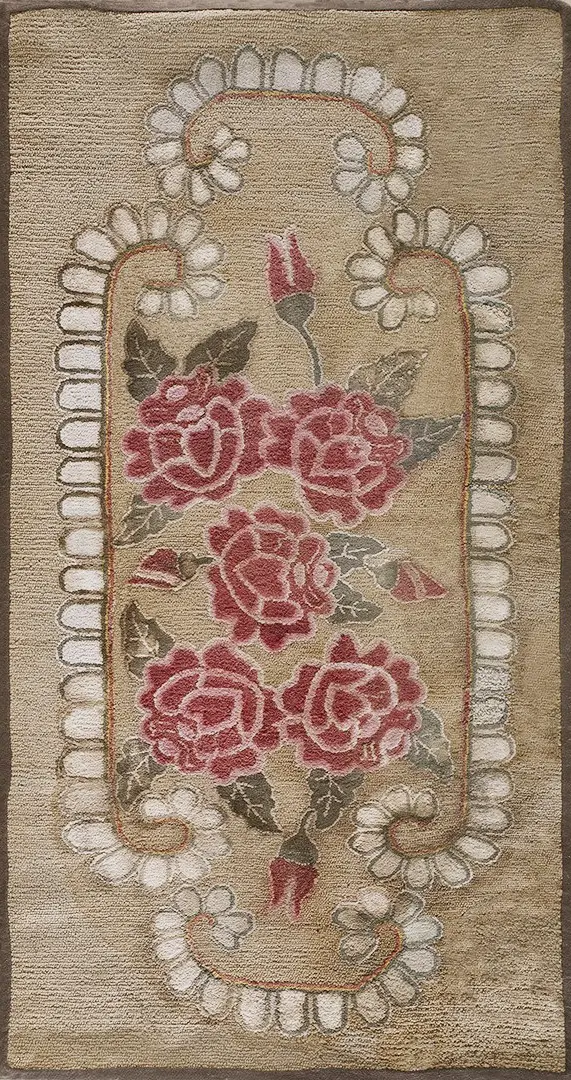 The field is rendered in a warm, variegated tan and brown earth tone, providing a grounding backdrop for the central motif. The dense, looped texture characteristic of the hooked technique gives the piece a tactile, dimensional quality, emphasizing its handcrafted nature.