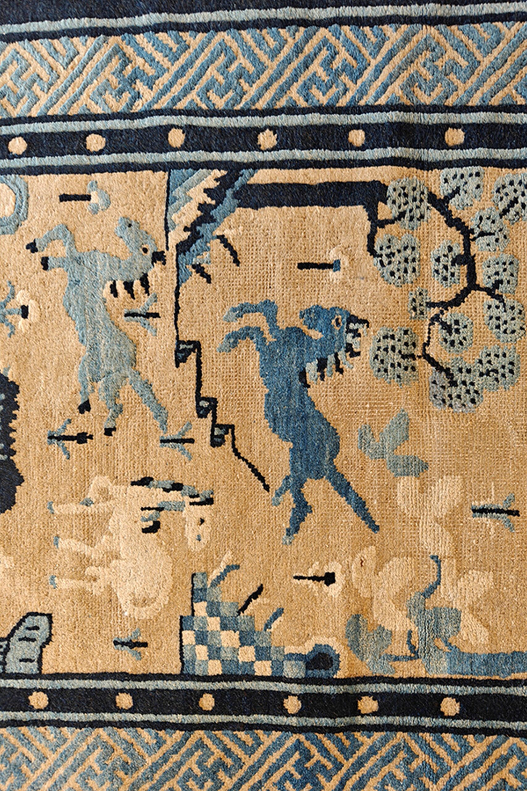 Framing the lively interior scene is a complex border system defined by bands of solid indigo and a striking outer guard border featuring the classic Chinese fretwork, often referred to as the greek Key running dog motif. This geometric precision anchors the whimsical field, balancing the rug’s overall composition with sophisticated structure and timeless design.