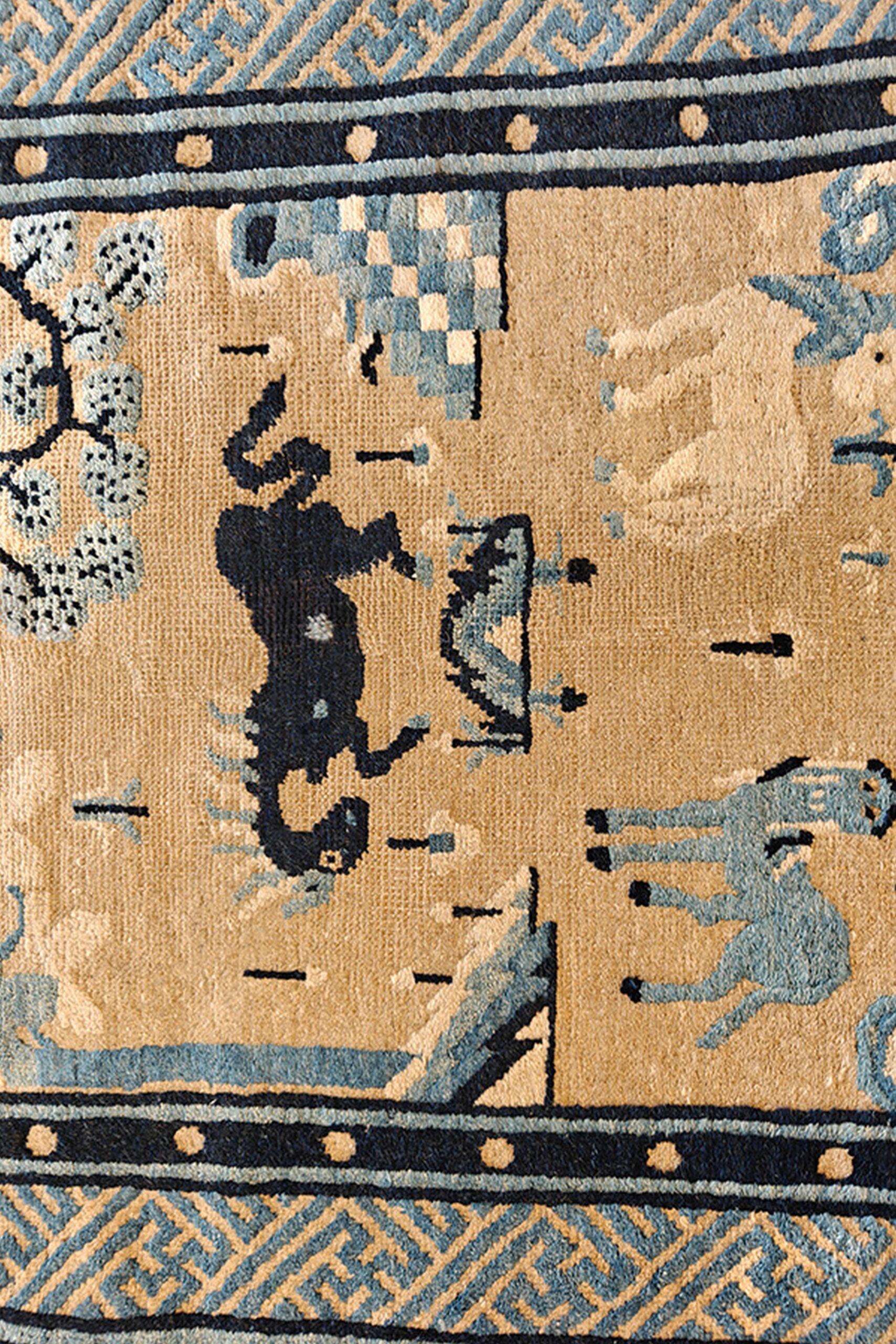 The field is dominated by a warm, sandy beige, characteristic of many early 20th-century Chinese textiles, providing a perfect contrast for the vibrant blue and deep indigo accents. The use of a neutral ivory beige cream ground allows the stylized horses, camels, and trees to stand out vividly, creating a dynamic, almost storybook landscape that is both whimsical and highly artistic.
