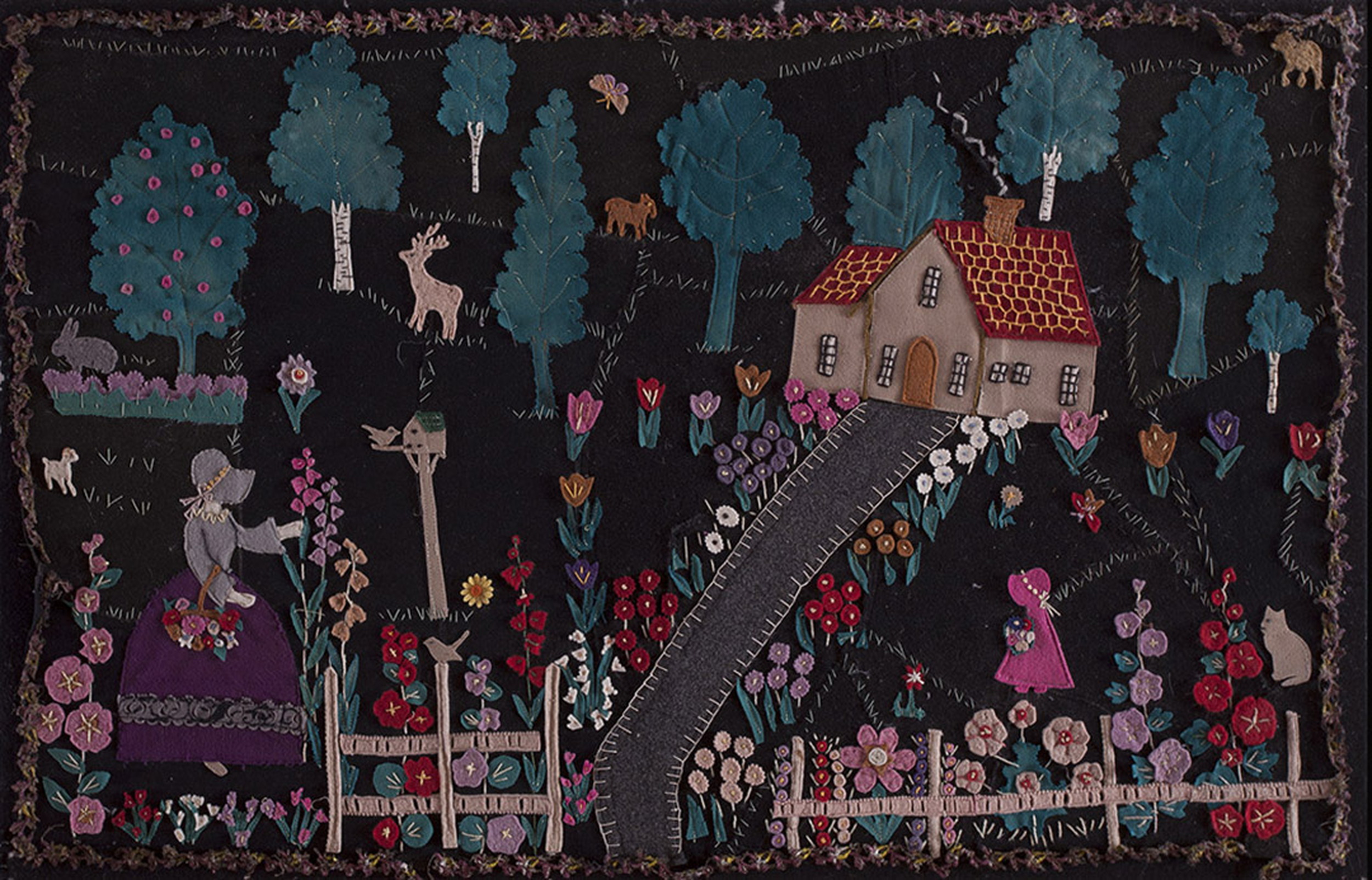 The design presents a whimsical domestic scene: a cottage nestled among trees, approached by a winding path, and surrounded by an exuberant garden. The highly saturated palette—pinks, reds, teal, and gold—pops dramatically against the deep, somber ground. The use of this striking black color ground emphasizes the vibrancy of the applied felt elements.