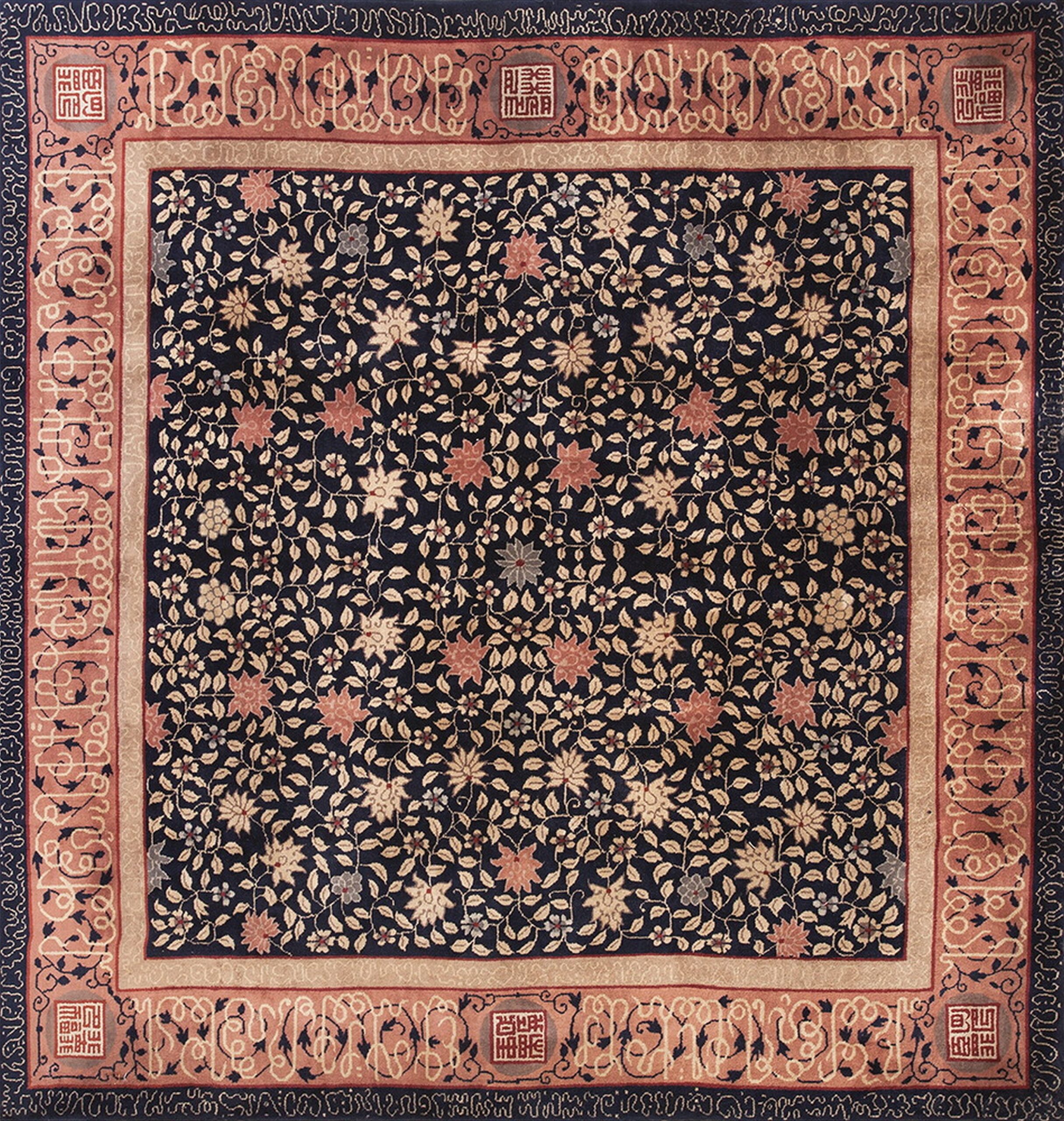 A complex, multi-banded border frames the central motif, utilizing a striking salmon-pink ground overlaid with dark, sinuous scrollwork and traditional Chinese seal motifs at the corners. The balanced scale and square proportions suggest this piece was intended to serve as a commanding focal point, defining the space within traditional room size rugs.