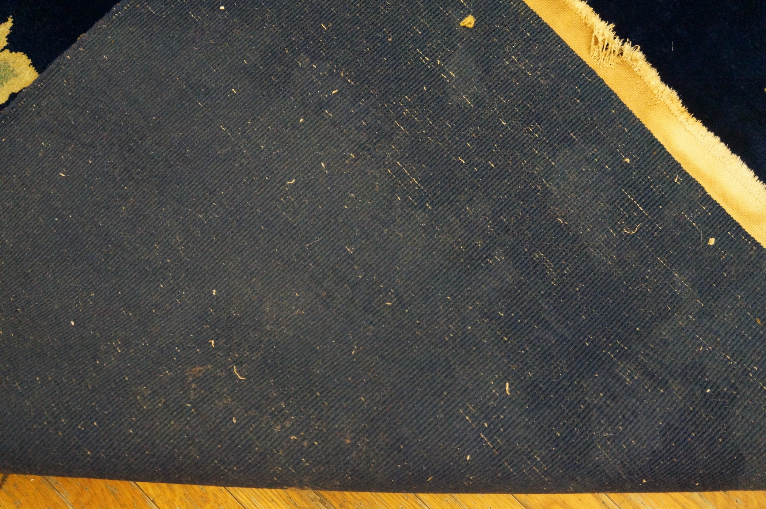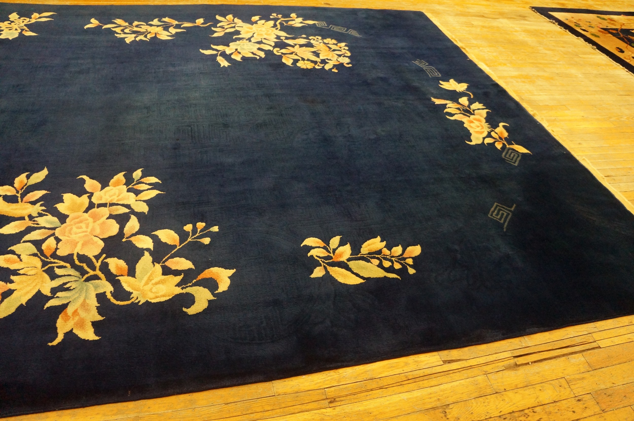 Antique Art Deco Chinese Floral Blue Navy 1930s Rug, Circa Date: 1930s. This exceptional Chinese Art Deco carpet exemplifies the sophisticated aesthetic of the early 20th century, merging traditional Eastern motifs with the streamlined elegance of the West. Its generous dimensions make it suitable for grand interior spaces, offering the presence of a true room size rugs.