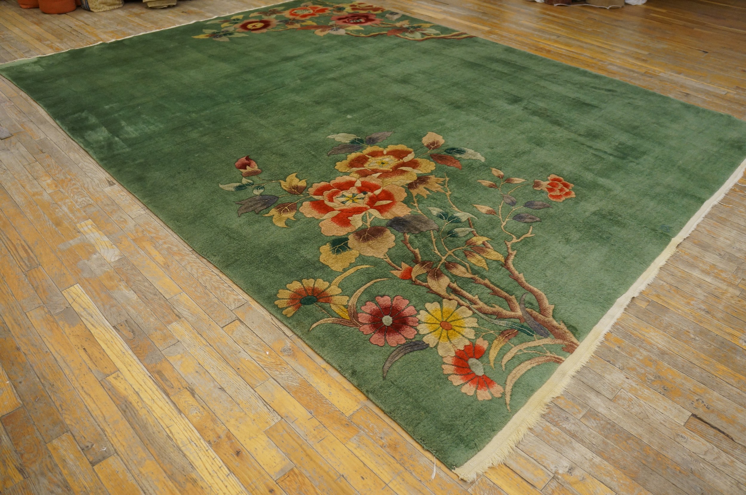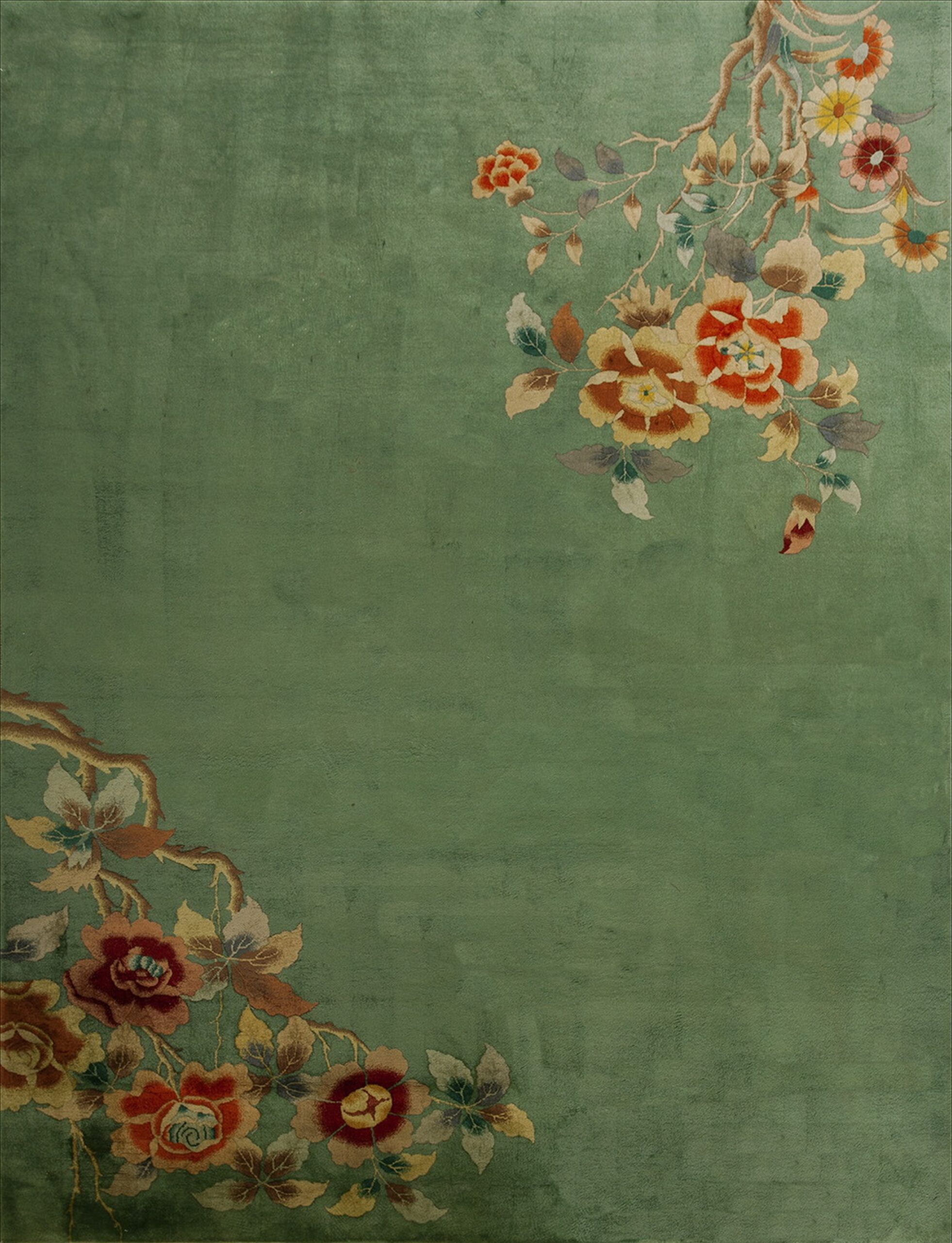 Antique Art Deco Chinese Floral Green 1935 Rug, Circa Date: 1935. This exceptional piece captures the transitional elegance of the 1930s, blending traditional Chinese motifs with the streamlined aesthetic of the Art Deco period. The design rejects the dense patterns of earlier eras, favoring vast, open fields of color that define the finest examples of antique rugs from this era.