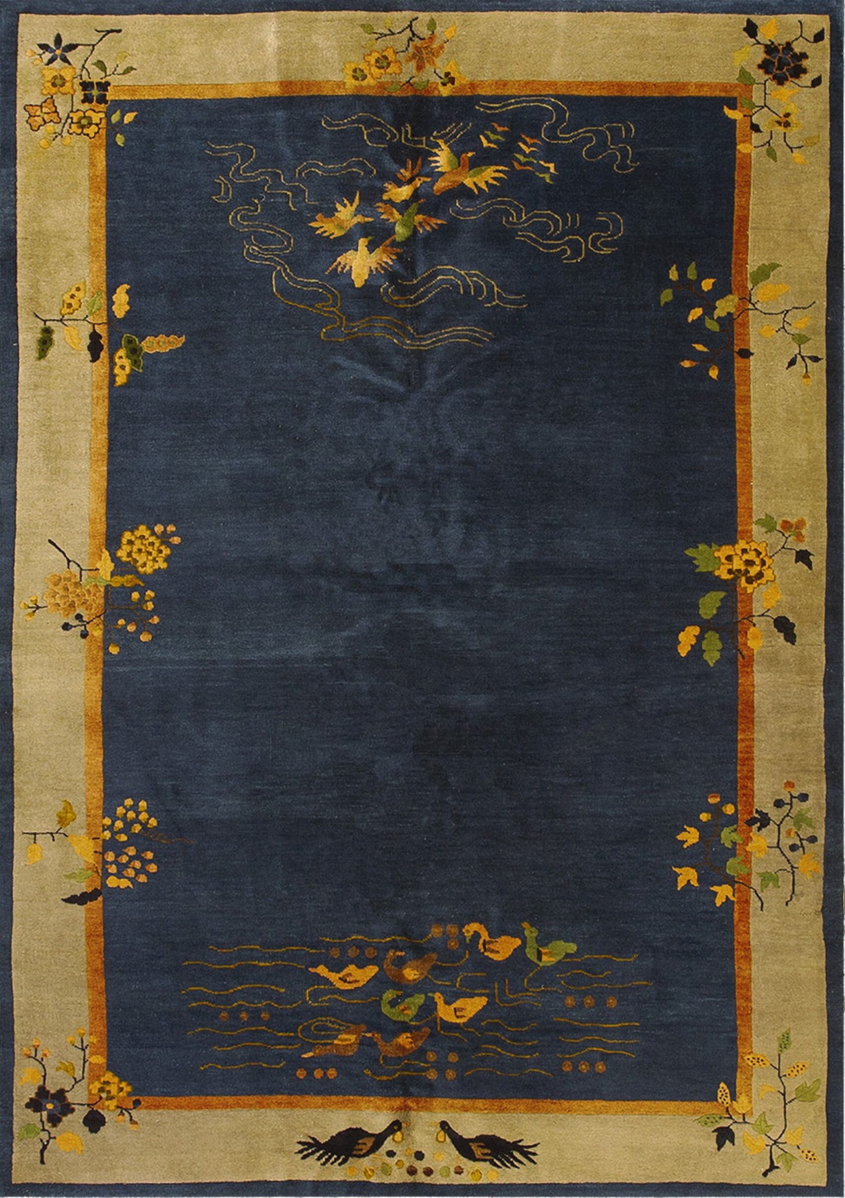 The striking composition is anchored by a deep indigo field, providing a dramatic backdrop for the stylized natural imagery. This rich saturation highlights the enduring appeal of blue color rugs in sophisticated interiors. The central field features subtle, stylized depictions of aquatic life and flowing water, rendered in fine gold and ochre tones, adding depth and narrative complexity.
