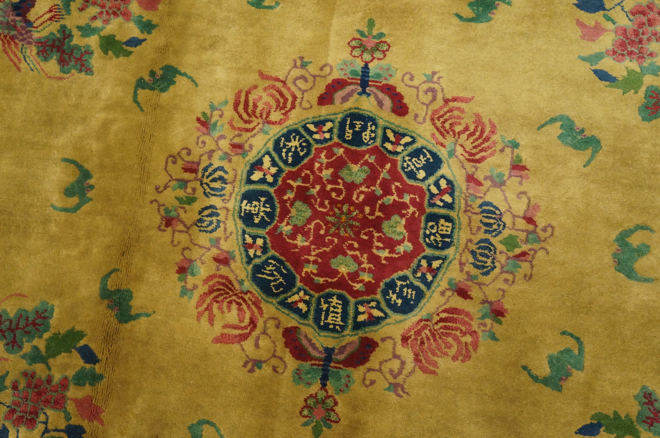 Antique Art Deco Chinese Floral, Medallion Yellow 1920s Rug, Circa Date: 1920s. This exceptional piece is a vibrant example of the transitional style that emerged in China during the early 20th century, seamlessly blending traditional iconography with the bold color palettes of the Art Deco era. The composition is highly detailed, showcasing the meticulous craftsmanship characteristic of the finest antique rugs produced during this period of artistic innovation.