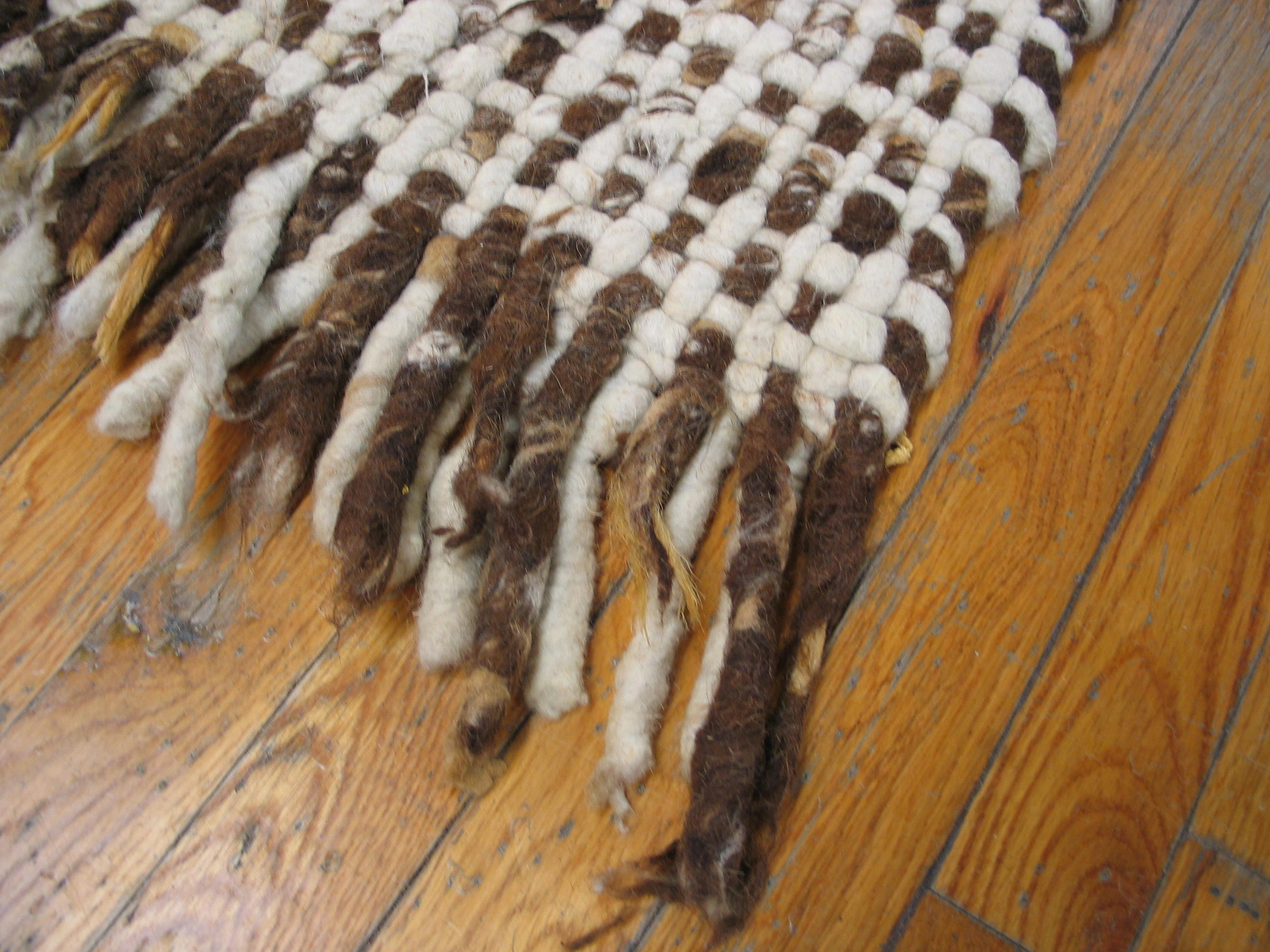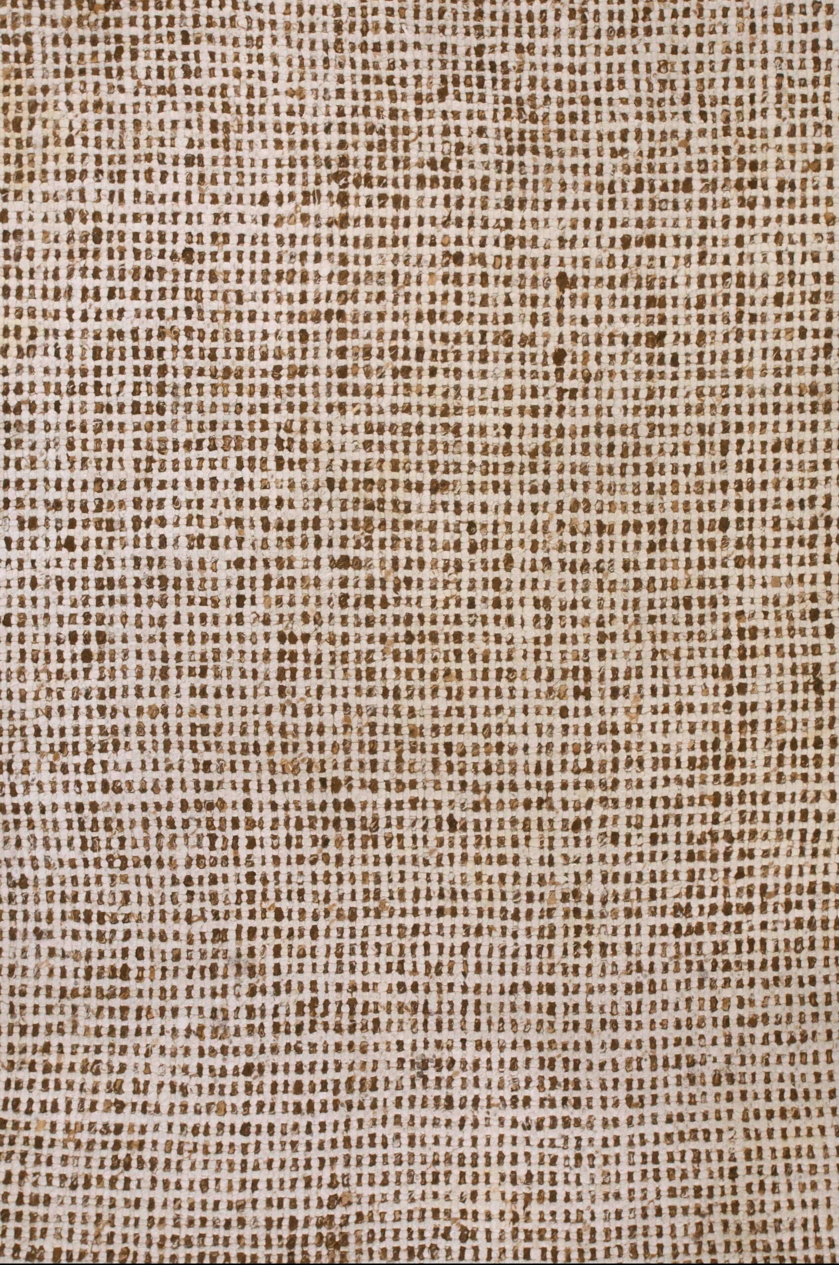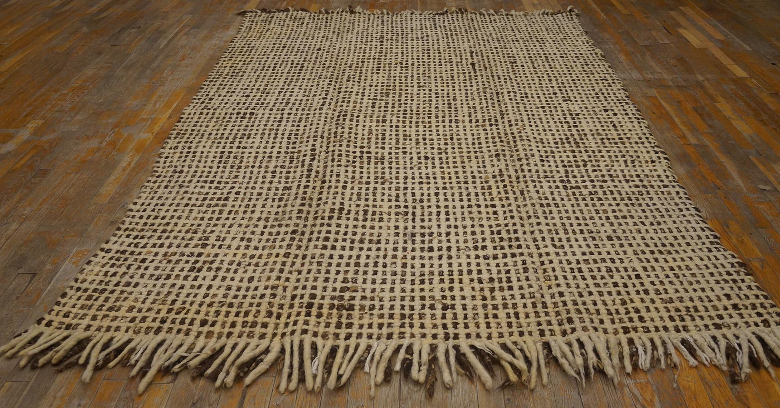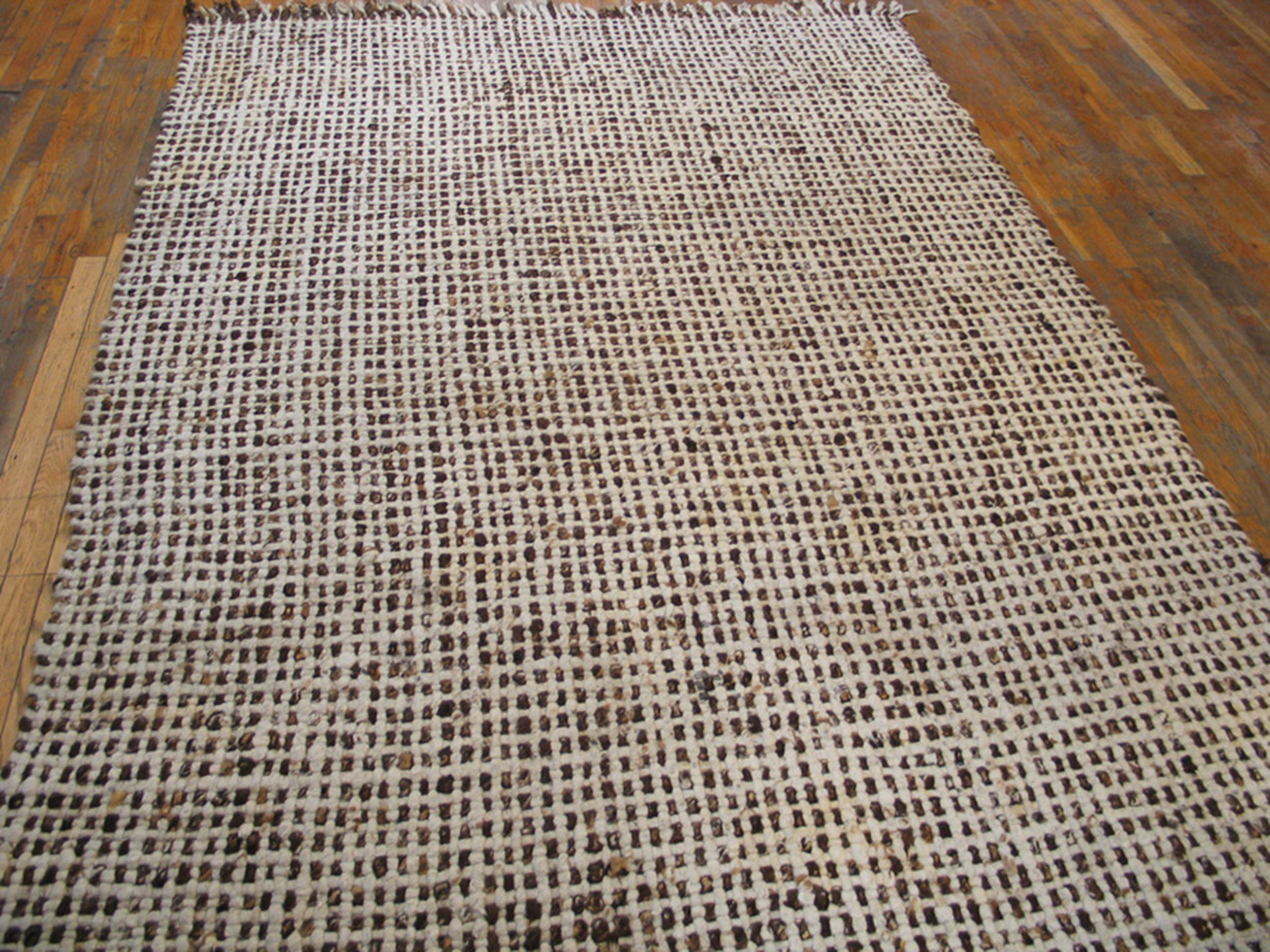 The design employs a subtle yet powerful grid structure, achieved through alternating blocks of natural, earthy brown fiber and lighter warp threads. This textural complexity creates a dynamic, woven canvas, presenting a sophisticated allover rugs pattern that avoids traditional borders or medallions, typical of abstract European design from this period.