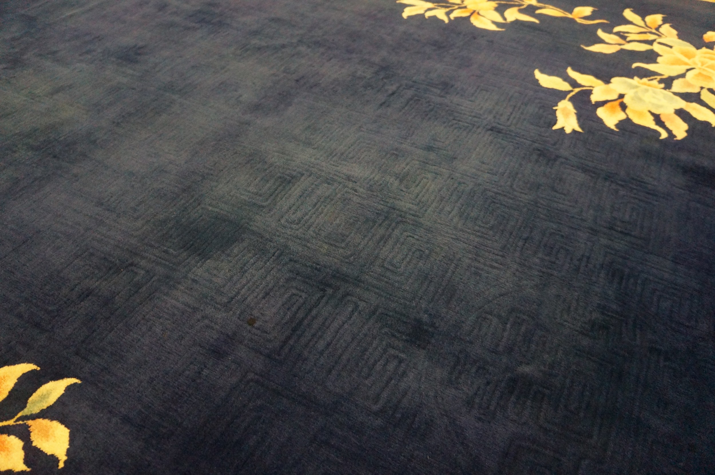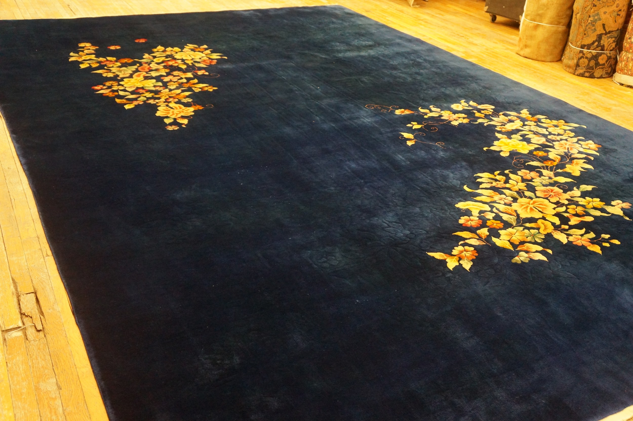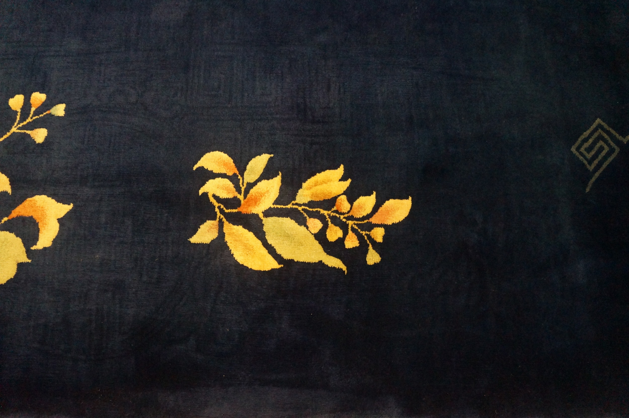 Antique Large Chinese Floral Hand Knotted Pile Rug, Country of Origin: China, Circa Date: 1930s. This exceptional piece captures the essence of the early Art Deco movement, utilizing a dramatic and expansive deep indigo field to create visual depth. The minimalist composition allows the luxurious texture and saturated dyes to speak for themselves, setting a sophisticated tone for any interior.