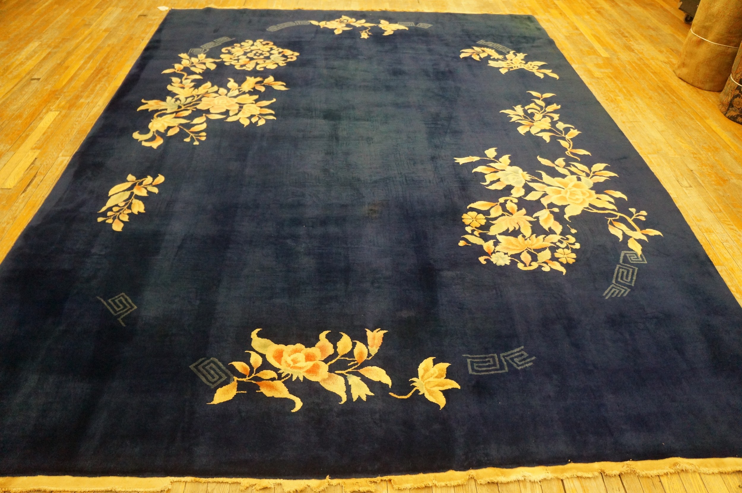 The substantial dimensions of this piece confirm its status as a statement furnishing. Its large format ensures that the dramatic contrast between the luminous golden silks and the matte navy wool is fully appreciated when anchoring a major living space or dining room. This hand-knotted treasure offers both historical provenance and enduring, timeless elegance.