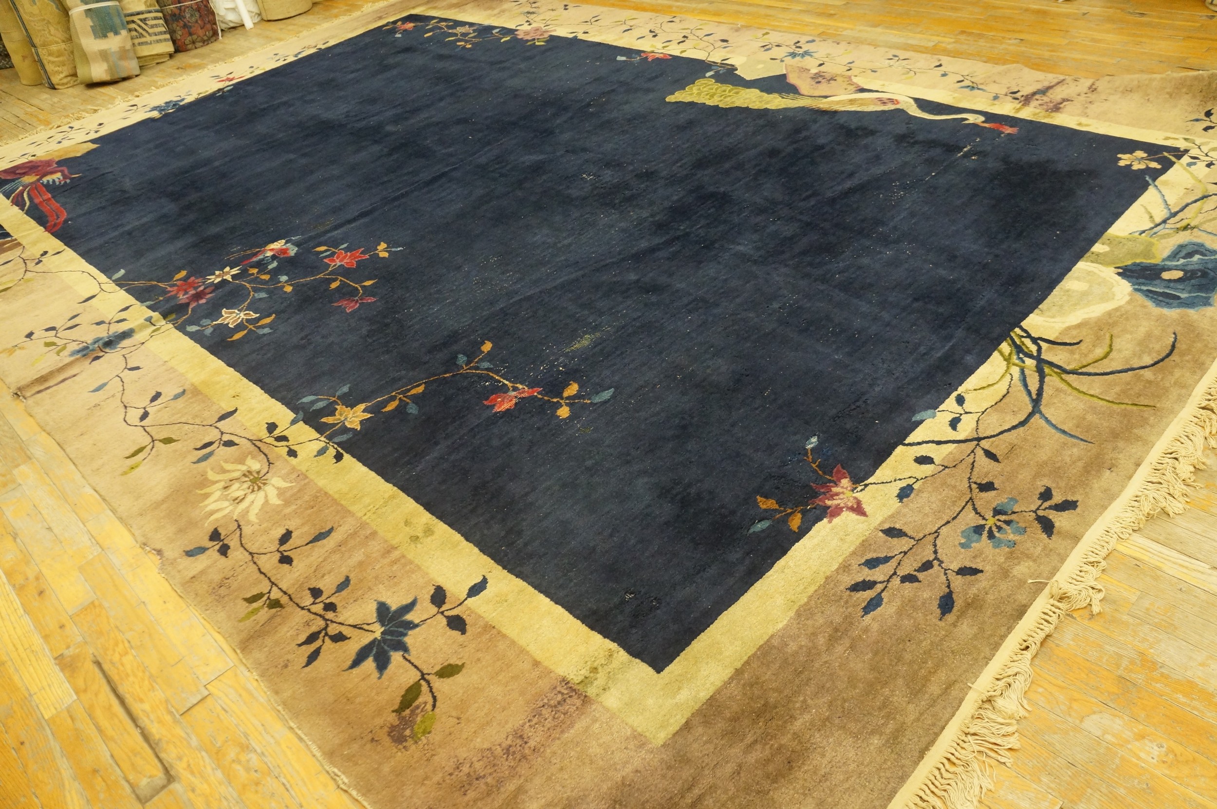 Antique Art Deco Large Room Size Wool Blue Rug, Circa Date: 1925. This exceptional Chinese Art Deco piece captures the transitional elegance of the 1920s, blending traditional motifs with modernist simplicity. Its generous dimensions make it an ideal choice among room size rugs designed for grand interiors.