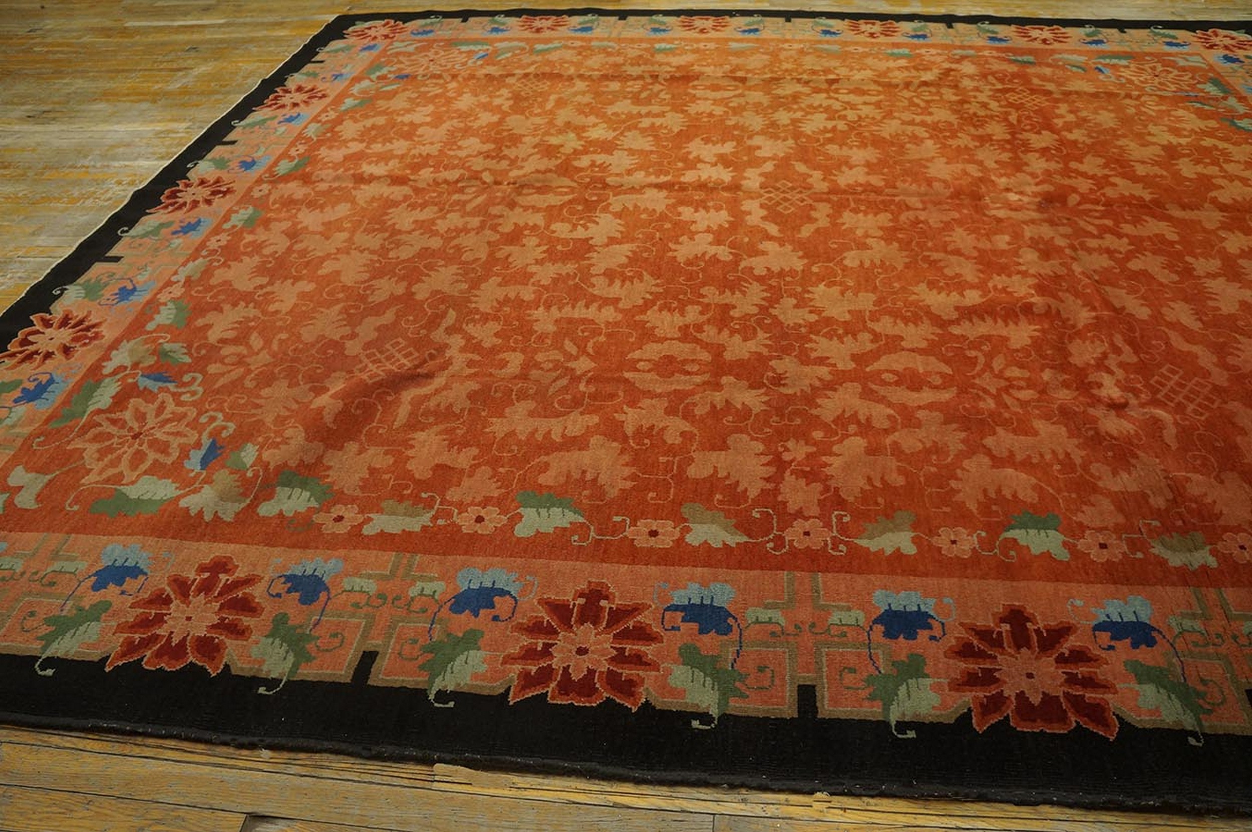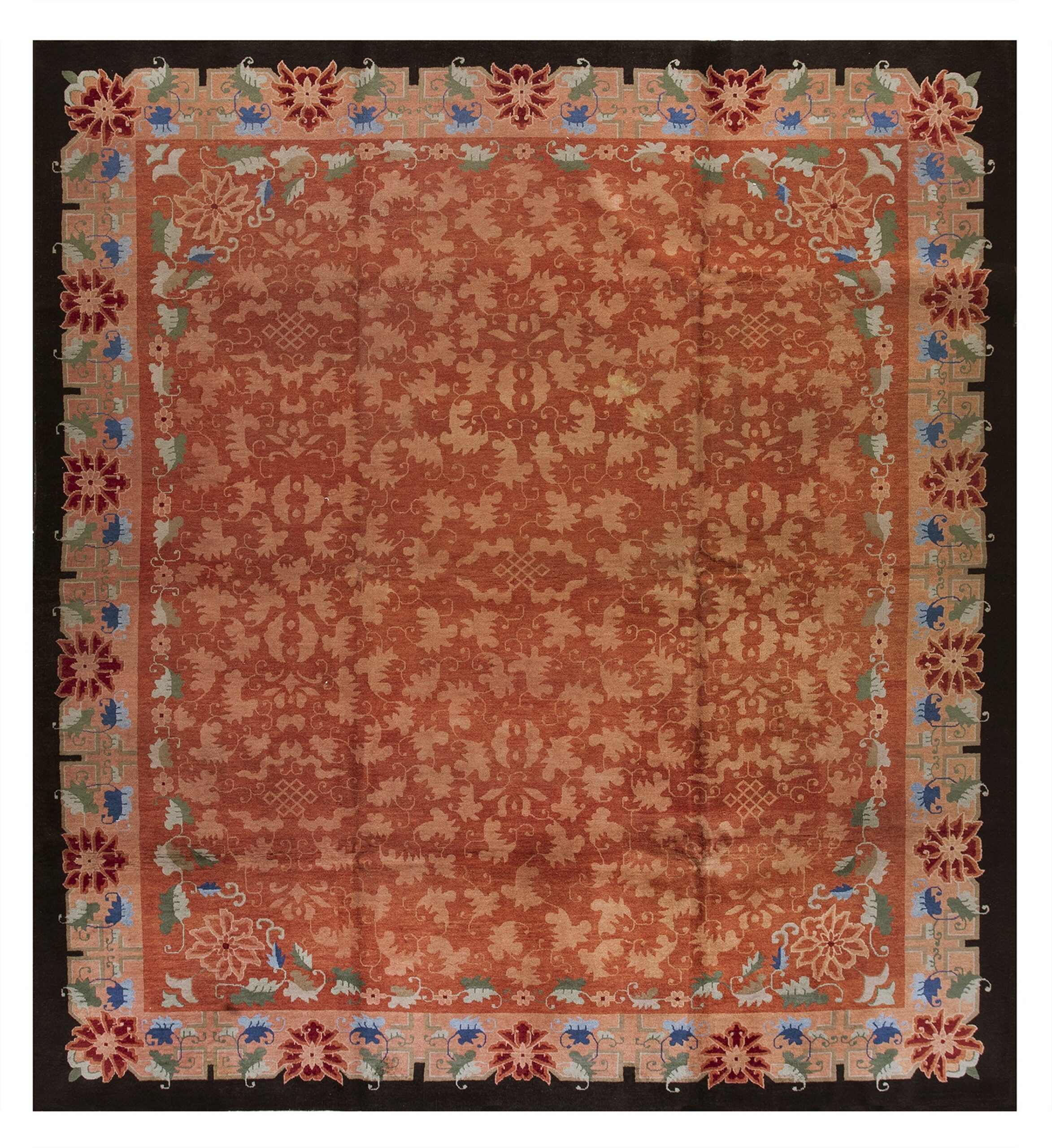 Antique Art Deco Room Size Wool Black, Salmon Rug, Circa Date: 1920s. This exceptional piece captures the transitional elegance of the early 20th century, merging traditional Eastern motifs with the streamlined geometry characteristic of the Art Deco movement. It is a stunning example among antique rugs from this highly collectible era.