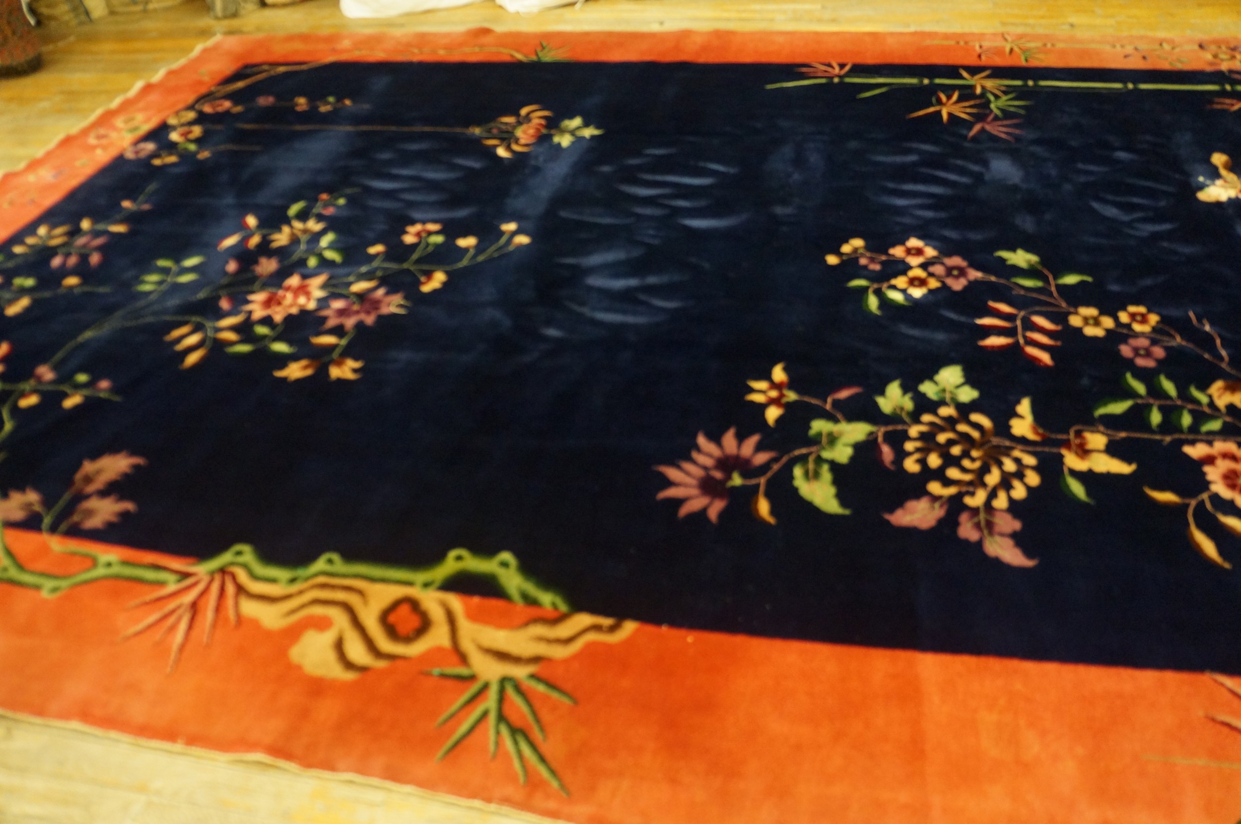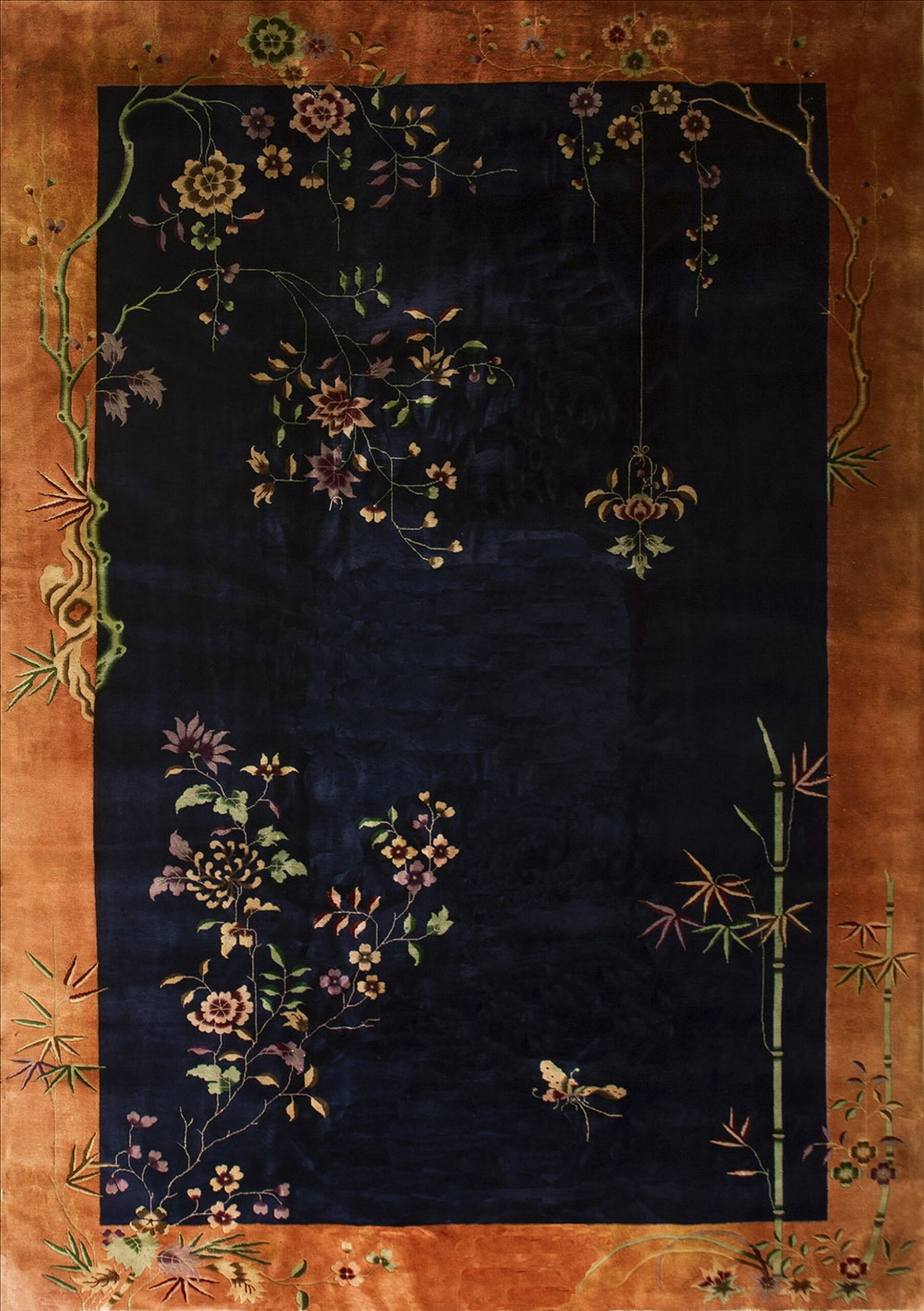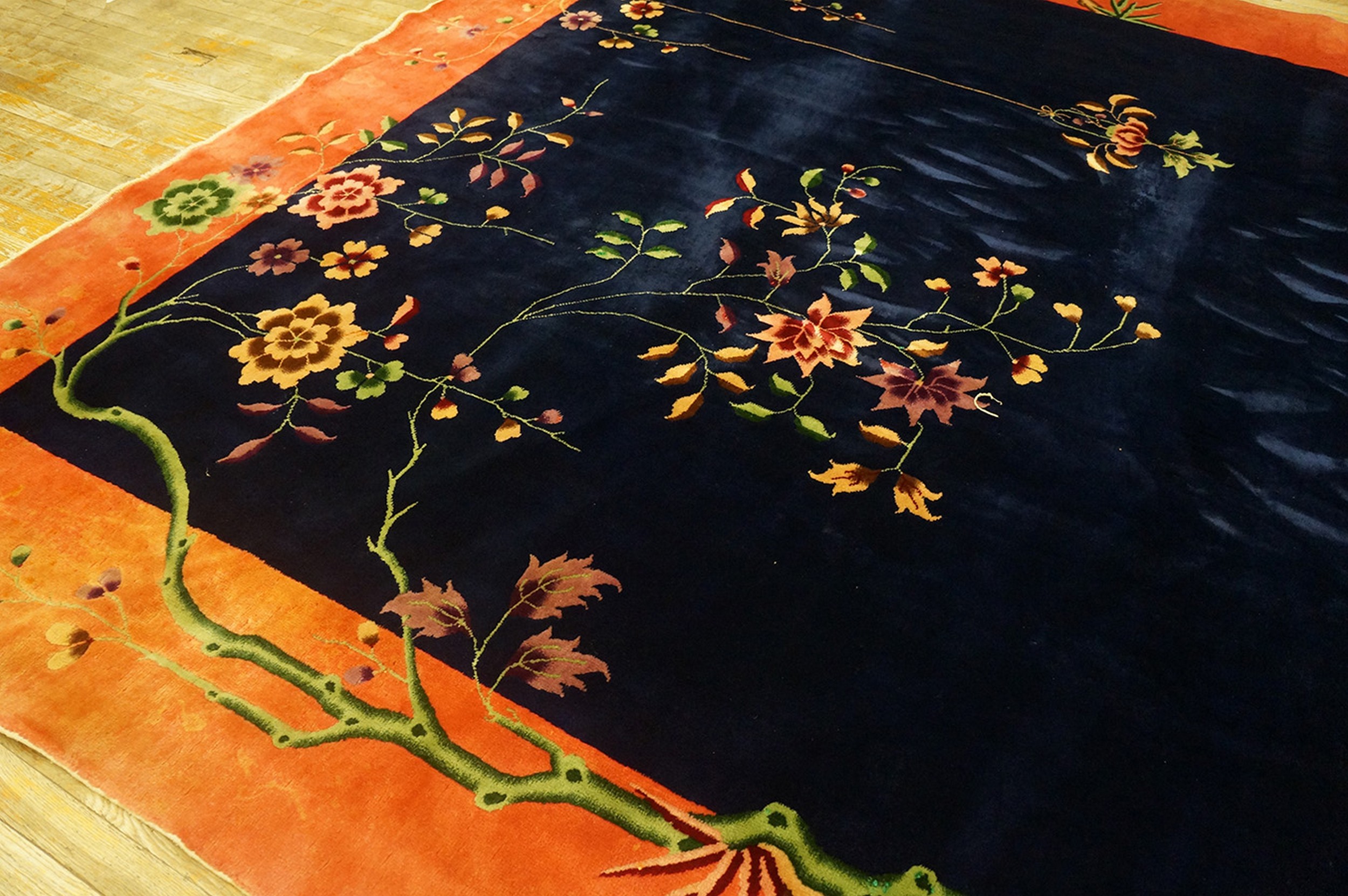 Antique Art Deco Room Size Wool Blue Navy, Coral / Salmon Rug, Circa Date: 1920s. This exceptional piece exemplifies the elegance of the early Art Deco movement, successfully merging traditional Chinese naturalism with a modern, simplified composition. It is a stunning and highly collectible example of high-quality antique rugs.